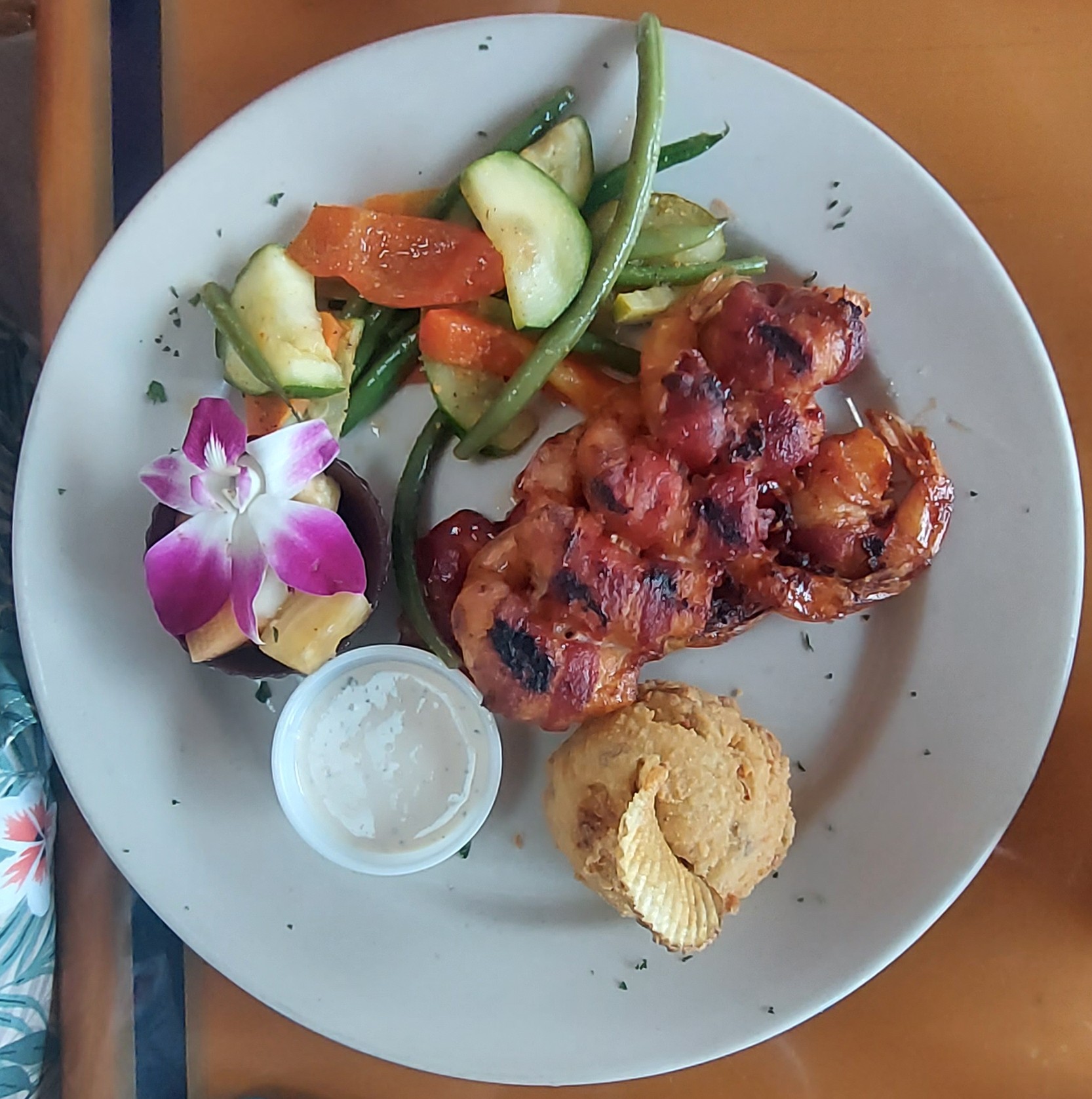 When we checked out the menu, it seemed a little pricey - $16 for a fish sandwich. But, we don't go exploring every day and decided to stay. I ordered the curried lobster salad, as it wasn't something that I'd had before. There was a good size mound of shredded lobster on the plate, surrounded by seemingly ripe fruit. The problem was that the lobster was totally overwhelmed by onion. I could taste the curry, but not really the lobster. For the price of the plate, $16 for a scoop of salad, the lobster should be the star of the dish. The fruit wasn't ripe, so I didn't eat it.
