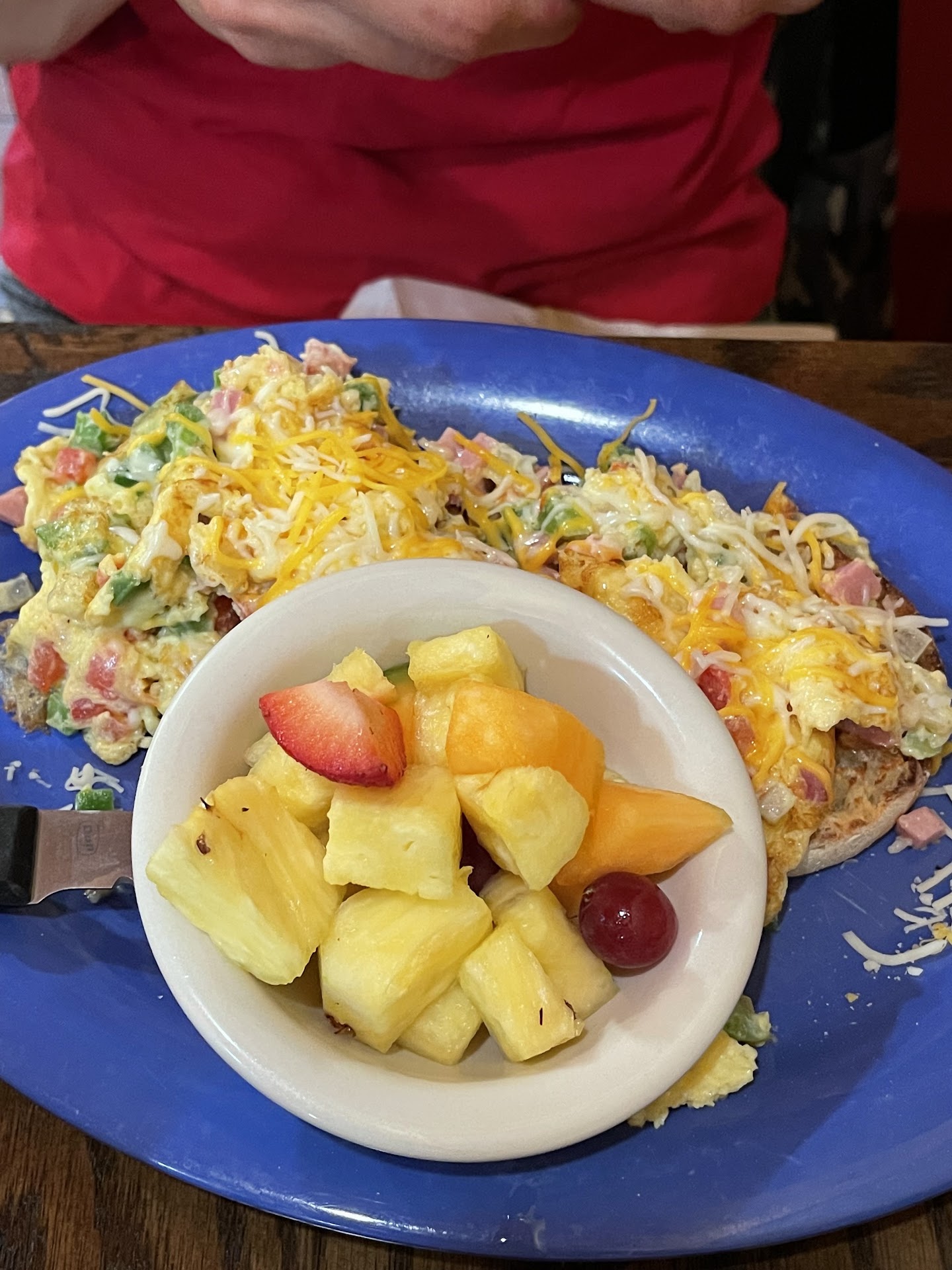 The salmon Benedict looked amazing but big for me, I inquired about a half portion and was told "Sure but still full price". I ordered a fruit bowl option with side of fresh muffin, grilled and a side of crispy bacon (you know, for protien). Hubby ordered the Ya'll Benedict (biscuit with sausage and sausage gravy replaced hollandaise sauce with grits on the side).