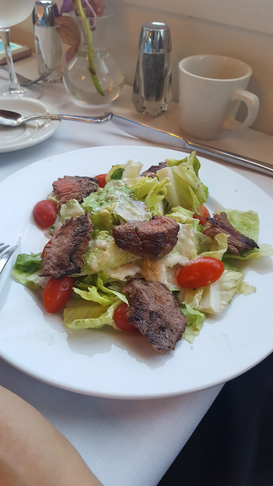 The food was incredibly lackluster. My wife ordered the steak and it turned out to be a steak salad even though there was no mention of salad on the menu and it was not listed in the salad section, it was listed in the entrees section. The seafood wrap had uncooked shrimp in it and in general the food was cold and unimpressive. It was not cheap though. Most meals started around $15 for what amounts to basic airplane food.