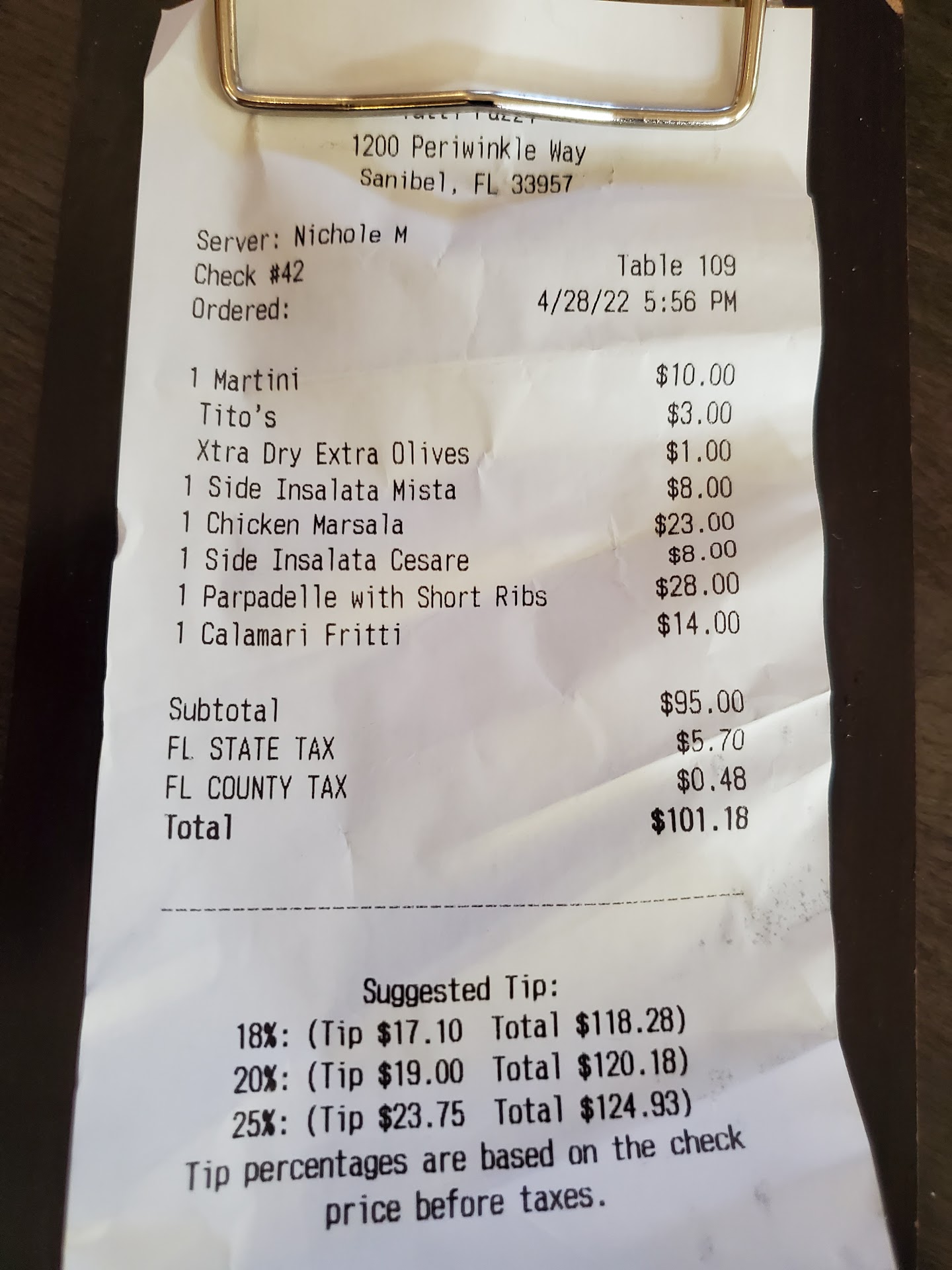 The FussBudget tour of Sanibel Restaurants continued tonight, on Thursday 4/28/22. We opted for Italian tonight after reading some encouraging reviews of Tutti's. We had a 6 pm reservation, arrived to a nice looking building with plenty of parking. The restaurant is on the 2nd level, and has a long ramp for those who might otherwise want an elevator. We took the steps. Things did not go as well as we hoped after this point.