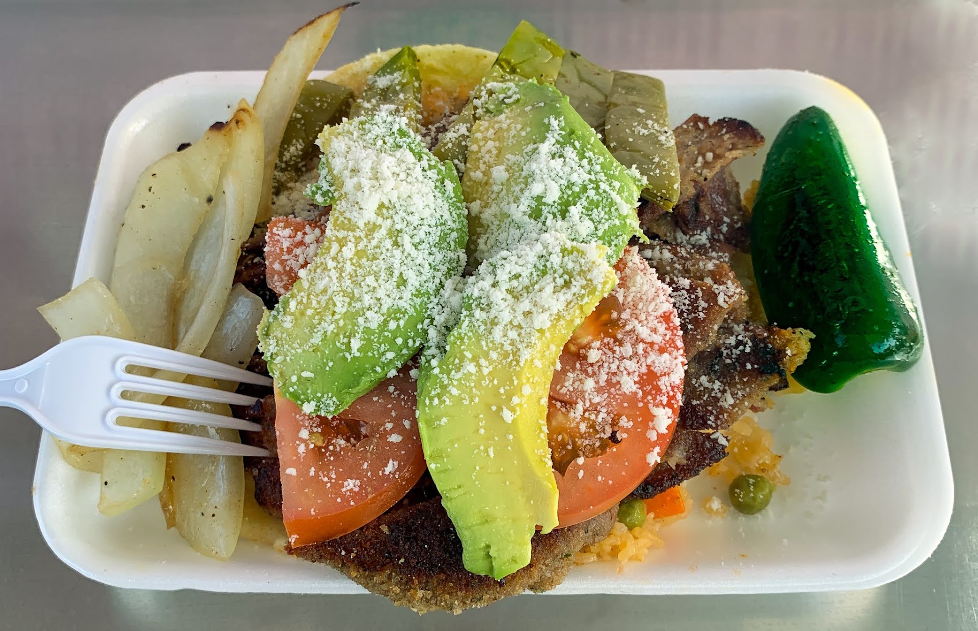Taco Acorazado translates to "Battleship Taco" and is named such because so much food is stacked into the taco that the whole thing visually resembles a battleship. The thick corn tortilla has more of the appearance of a flatbread than what you would traditionally expect a corn tortilla to look like. Directly on top of it sits a mound of fluffy short-grain rice simmered in caldo de tomate and spiked with corn kernels, chopped carrots, and peas scattered throughout. Accompanying the rice are sautƩed onions and nopales (chopped cactus pads), sliced tomatoes, avocado chunks, cotija cheese, and a grilled jalapeƱo. And then there's a full meal's worth of "milanesa de res," a kind of Mexican "chicken fried steak" where a cut of beef is pounded until it is flat and thin, then dunked in egg batter, rolled in breadcrumbs, and fried. The result is tender, yet crispy; beefy, yet bread-y; salty yet subtle.