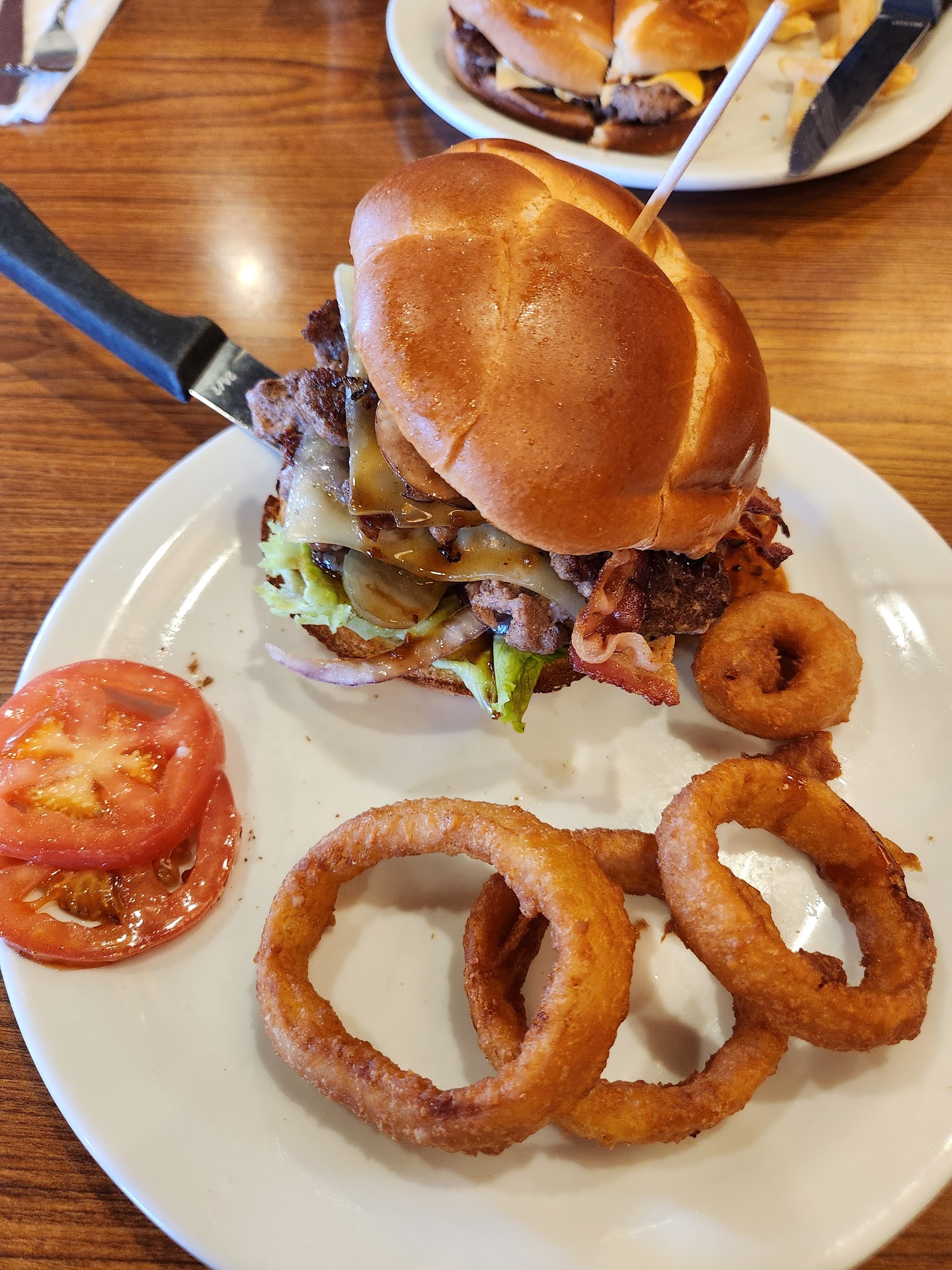 First, I must say I usually don't have a bad experience at this Dennys, however the last two times I have come have been disappointing. I will not post my first review as I was giving them a second chance. However, I feel I need to at this point. First, I ordered the bourbon bacon cheeseburger with a double patty and onion rings instead of fries. I also asked for no tomatoes as I have a mild allergy to them.... but as you can see in the photos, I got tomatoes anyway. No big deal, I obviously removed them and took some medication later. But it only wasn't that, as you can also see, I got 4 onion rings in place of fries????.... give you a handful of fries, but 4 onion rings then up charge you???? It's a bit ridiculous if you ask me, so what do I do?? I ask for a little more onion rings... the second photo of the other 4 onion rings was what I was brought( my little more)... totaling 8 onion rings. Okay, maybe I'm being picky, but if you're going to up charge me, please give me more than 8, onions are cheap, and they are multipurpose use. Why not pour them on my plate like fries???? No worries, I can get past that, but let's look at the boneless wings I ordered....FYI, those are supposed to be bbq boneless wings, I mean just give the plain chicken and let me dip them in myself. And when they ask you about sauces, it's not the sauce the chicken will be in. They mean like ranch or blue cheese dressing (sauce on the side). Now, to top all this off, there was only 1 waitress working the whole restaurant for roughly 20-25 people. While I saw several people in the back, including managers, at least 2 of them and no one helping out, so naturally she didn't come by and check on anyone's table or make sure there was nothing needed from any customer she was constantly running around, then proceeds to just give me my check. It's not a big deal whatever, I guess I was done anyways... but here is the kicker...the total cost with tip and taxes came to $81.46 for two people. Sorry Dennys, it's only a 3 star for me. However, I will say the food was good and the...