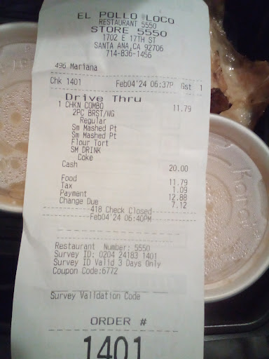 Read moreI'm disappointed and feel robbed! I stopped at Pollo Loco @ 1702 E 17th St Santa Ana I ordered a classic tostada salad. When I opened the container, tostada lacked the delicious look. It barely had chicken I brought it back to counter and asked the male cashier hoping he'd be honest when I asked if that was the correct amount of chicken, he replied yes, that's a scoop of chicken. The answer disappointed me and was like laughing at my face especially when he added, "why, you want more?" I grabbed my sad looking meal and went back to dining area. I began eating and discovered it only had a few grains of beans. Because it didn't have correct portions of beans either. I did not want or ask for anything. That wasn't my intention but did expect an honest reaction as meal wasn't prepared correctly. And he simply had the audacity to state it was. I know that if he'd have been in my place, he'd have taken item back too and complain. So my experience here was not good at all. Let me add that waiting time to order was ridiculous and no employee or manager came out to acknowledge our presence in line, drinking fountain didn't have a drink and filthy dining area. My experience should be zero-star rating but 0 not available so they get 1 star. Plus as a customer I wouldn't recommend this store. My opinion, remove classic tostada from menu so they sell the double chicken tostada and guests get the food they paid for, re-train the staff on "doing things right" and "monitoring operations" and have a management staff in the front line to attend issues. Good luck if you visit this store! 3/23/22...