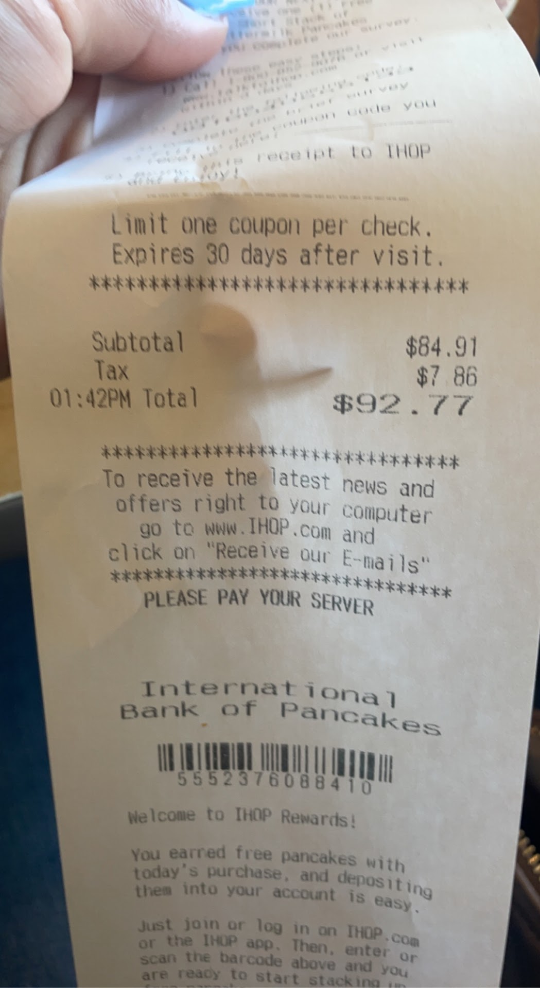 Read moreWe came in party of 3 on a slow day and restaurant was half empty only about 2 booths occupied already served and we sat and waitress took our drink orders. She came back with our drinks and we ordered an appetizer along with our food. 30 mins passed no food yet or anyone to come check on us. A family of 4 came and sat next booth to us and same waitress got their drinks and order. About 20 mins later they recieved their food!!I called over the waitress after she served them and I told her that I didnt want to be a bleep but why did they got served already when we were here first and waiting for over 30 mins!!!NOT EVEN BUSY!!!She apologized and 5 mins later she brought our food along with our appetizer. Point of appetizer was to bring it first while we waited. She brought it along with our main food which was so stupid.Our $18 omelettes were cold and I had asked mine with avocado on top. She came back 3 mins later with a small plate of avocado on a piece of lettuce. Terrible service for a $92 bill. With everything going up you expect some decent service. Tipped her $1. This IHOP needs to be looked at in hiring new staff. No wonder this place is always empty and yet they cannot be quick to service you.Never eating...