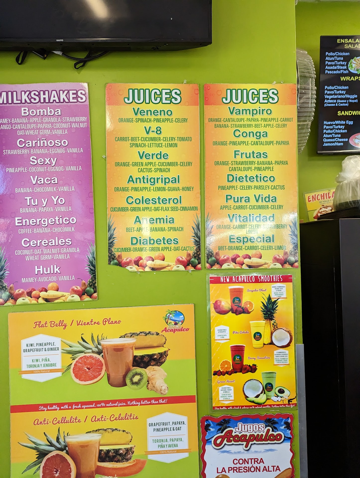 Read morei just started coming here. I dont speak spanish, but they help me the very best they can. I always see so many people come out with all sorts of different drinks..i get my usual banana, orange and pinapple. one day im gonna try one of those crazy green ones! They are really great here. everything is fresh and the girls in the front are very helpful and the cooks in the back.. they make really good...
