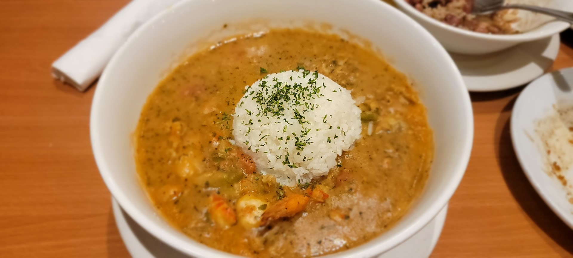 The location is within south coast metro's revamped buildings dubbed "The Gateway". This revamped area welcomes Cheff Ritter with open arms into the home of south coast's foodie central. From the outside of the restaurant you will immediately notice this location's huge open windows looking into what just looks like "the right place to be". The venue itself is slightly small so there may be a wait for you to have an open table, however don't let that sway you to the second rate restaurant across the street; this place is well worth the time if you want to have a bit of Cajun. Upon walking the sound of spoons scraping for the last morsel of gumbo drown out the blues music in the background. The smell of bubbling goodness permeates the air. Yea... the right place.