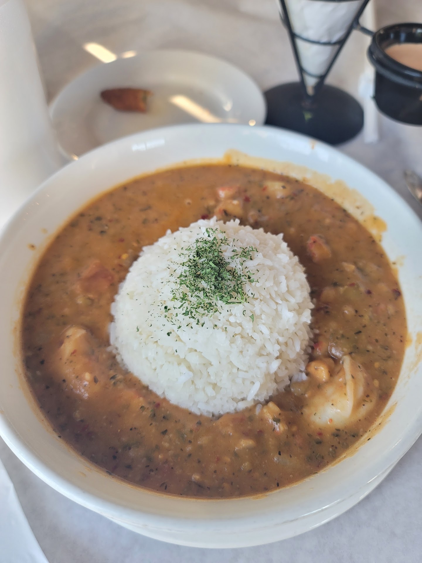 Cioppino is kind of bland, compared to a real Italian version or even the siete mares Mexican version. Filling, but not heavy. The Gumbo is HEAVY and will sink your battleship so don't try and eat this on your own. It really should be shared, it's also not cheap or small at all. Etouffee is like a lighter version, but the only item with crawfish. They really need to have that a la cart. T Pan Roast is also a large shared item somewhat like paella.