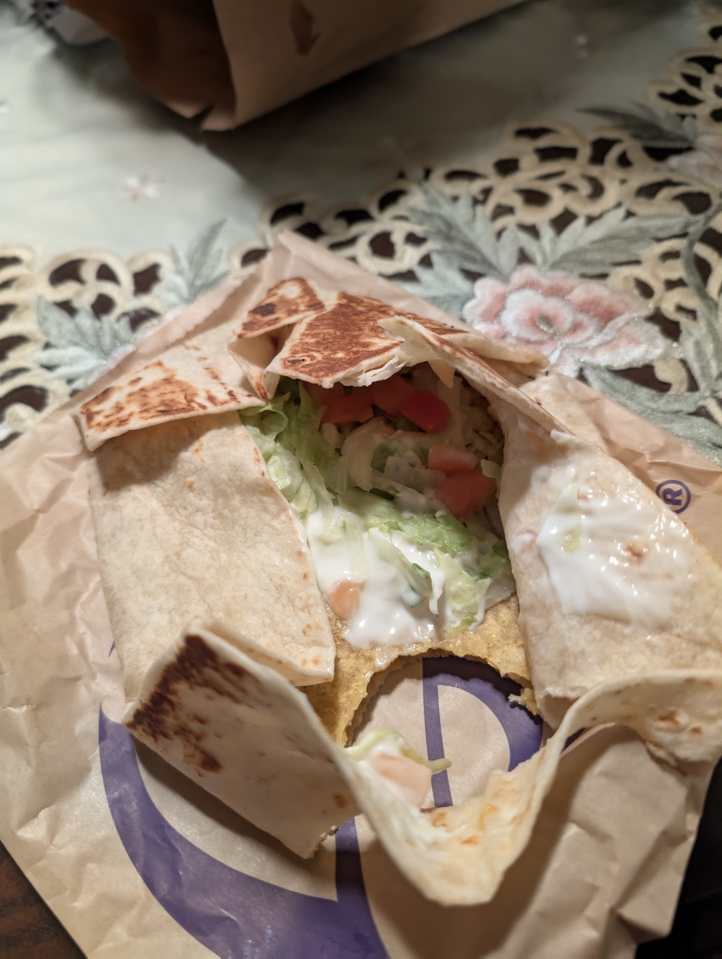 Ā Ā Ā Read moreNGL it was my fault for not reading the reviews of this location. If you want to be ripped off, come to this location. I paid 15 dollars for this. Fries weren't even filled half way, and little to no meat on a chalupa. The only good thing that came out of this was the Baja blast. I've tried other chalupas at other locations and by far better than this, haven't been to Taco Bell in months and wanted a chalupa. Shouldn't have come to this location tho. So definitely there is a problem with this location. Could be that the workers were tired, but for the amount of food I got I should have paid 7 dollars for it and not over 12 dollars. NGL if I wanted nothing in the food, I would have just eaten air, would have been better than this food. Ruined my dinner for tonight....