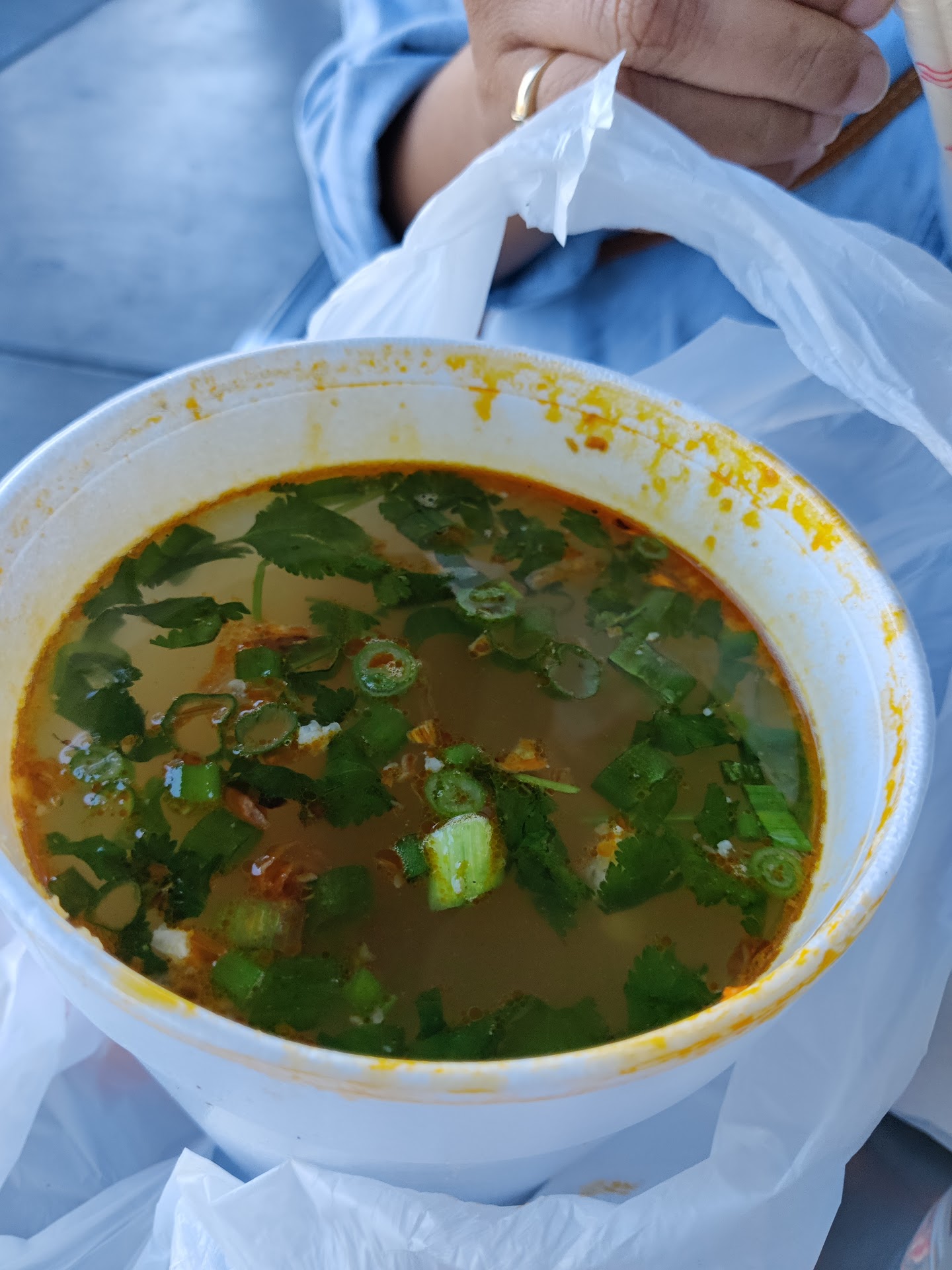 The chicken is cooked and added separate, also like pho the vegetables are added afterwards giving it more of that salad feel than porridge style which is kind of all inclusive, but make no mistake the chicken is good. Nice and hot, but the star is the fish porridge. Tons of flavor. Their to go is great because they package it all up and include the spoon, not even every pho place does that well.