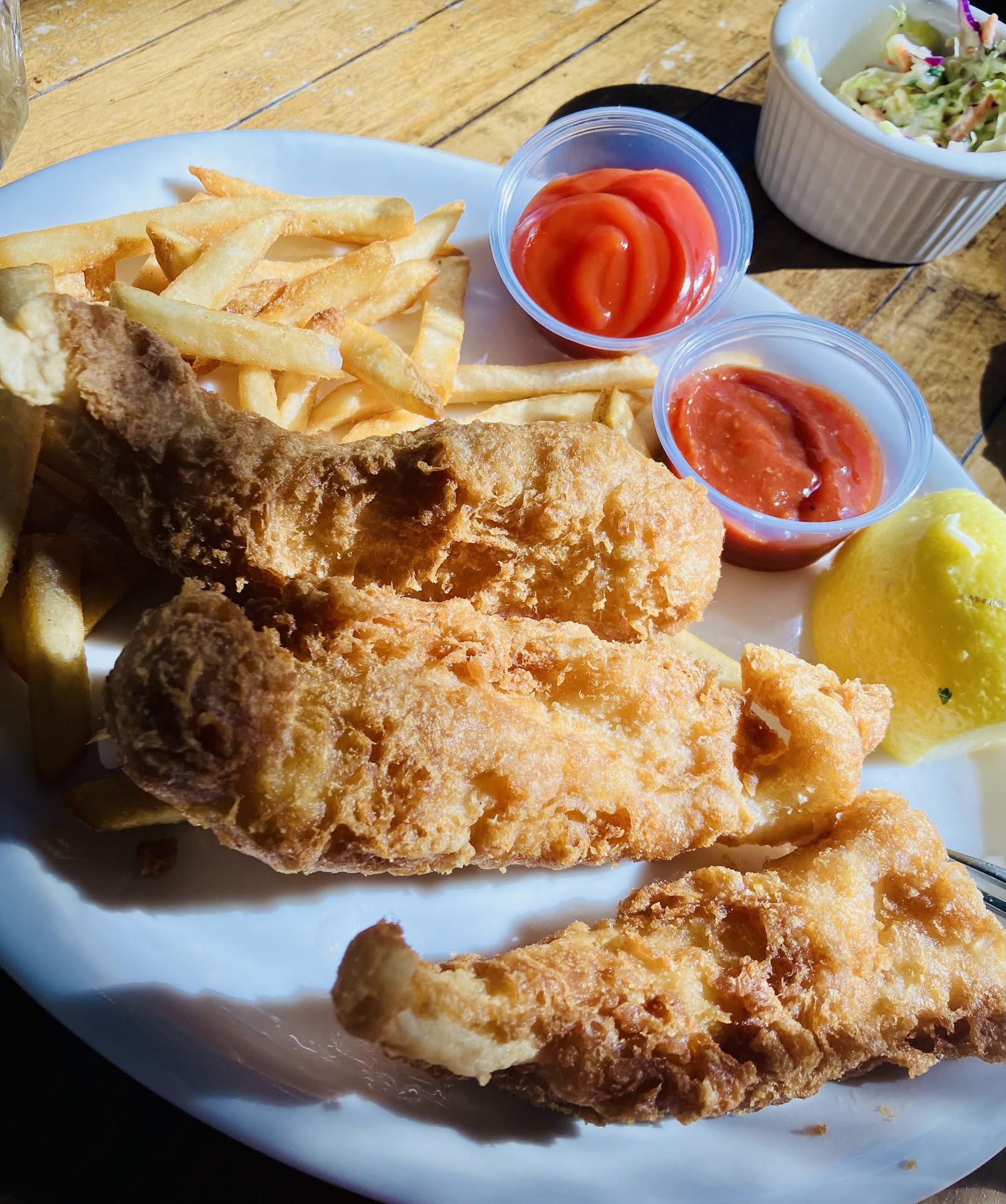...but, it took a long while to get that sorted out. We had to wait well into our meal for the rest of the fish taco dish to be ready. At the very least, they let us keep the fish taco appetizer at the table, so the orderer didn't have to wait for the whole dish to be remade while the other two diners ate their meals. I don't quite understand why the serving that evening was so jumbled. We had at least 3 different servers at our table of three which made for confusion when ordering, correcting the wrong order, and getting the check. The servers themselves were very friendly and polite, apologetic when mistakes were made, but the whole system seemed confused and disorganized. First experience here we had one server the whole time so that went smoothly.