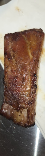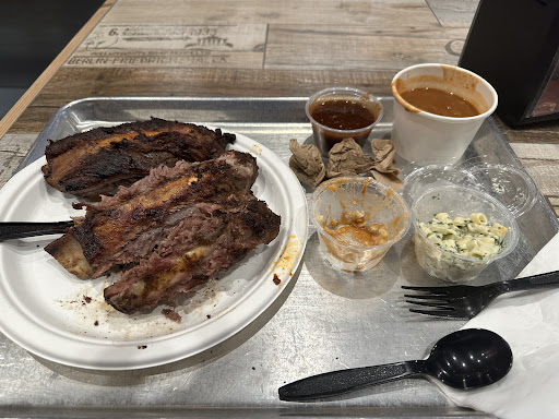 Starting with the service, typical order at the register style and flip the tablet for the tip up front. Left 20% and now regret it. Ambient music is nice, mix of western and country twang. Ordered the beef rib dinner. Now, my expectation was juicy, savory, fall off the bone bbq smoke flavor. Was I wrong to expect that? Yes. Santa Barbara has created their own style. I was served fast, a tray with three large ribs that were looking delicious along with two small sides of potato and macaroni salads. You’re only allowed to choose two out of three side options, even though the menu has about 10. Seemed a bit small, but what the hey. They’re playing second fiddle to their three smoky friends. When I grabbed my plastic cutlery (yes, plastic) to remove the meat from the bone I was met with resistance. Being a young, strong fella I decided to give it more force because I was seated with a lady and didn’t reckon on her mistaking me for a velociraptor. Sadly, the plastic fork and knife were bending like a Christmas tree with a two-ton star atop its boughs. Had to go caveman and attack it with my chompers. With my heart sinking along with my experience and expectations, my incisors were no match for the beefy ribs and intact membrane. The meat had no hope of being separated from its superglued membrane, let along the bone. It was holding on like a German shepherd grips its favorite toy. In the end I was left with three sad, half-eaten ribs. I really wanted that meat, but sans real steel in my hands or Wolverine’s adamantium claws I was just left with sore teeth and a bad attitude. Someone...
