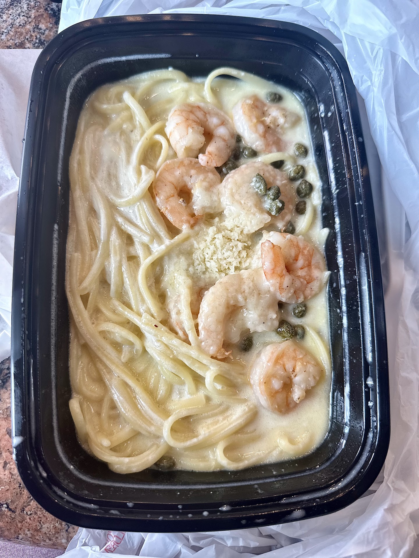 Went here for the first time on a weekend around 3:00 PM. They’re a small, cozy little restaurant so there’s minimal seating inside if you’re looking to beat the heat. Most of their seating is outside and in general, their food is catered to those who are looking for a quick, on-the-go meal. We ordered the Shrimp Piccata and Chicken Alfredo with some drinks from their refrigerator on the side.