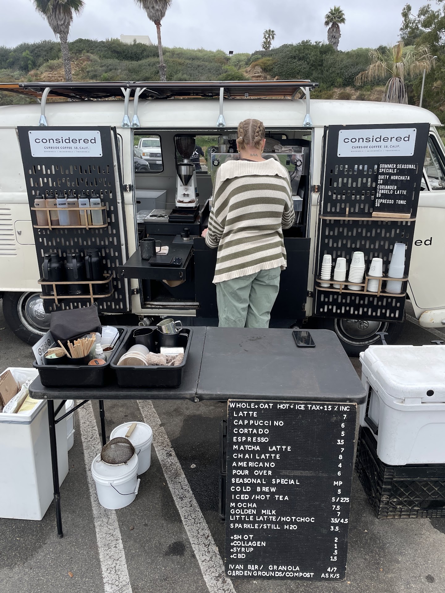 Read moreIn our recent visit to Santa Barbara, and always being in search of fine coffee wherever we go, I came across Considered on Yelp but, alas, the listed address was not in our path. Much to our surprise, in a visit to the Santa Barbara Mission, there they were in a cute converted vintage VW bus, ready to make the requisite cappuccino. It was made to perfection, with that desirable "structured" consistency, and was quickly consumed. The baristas were friendly, the atmosphere fantastic, and the chance intersection with our activities added to the...