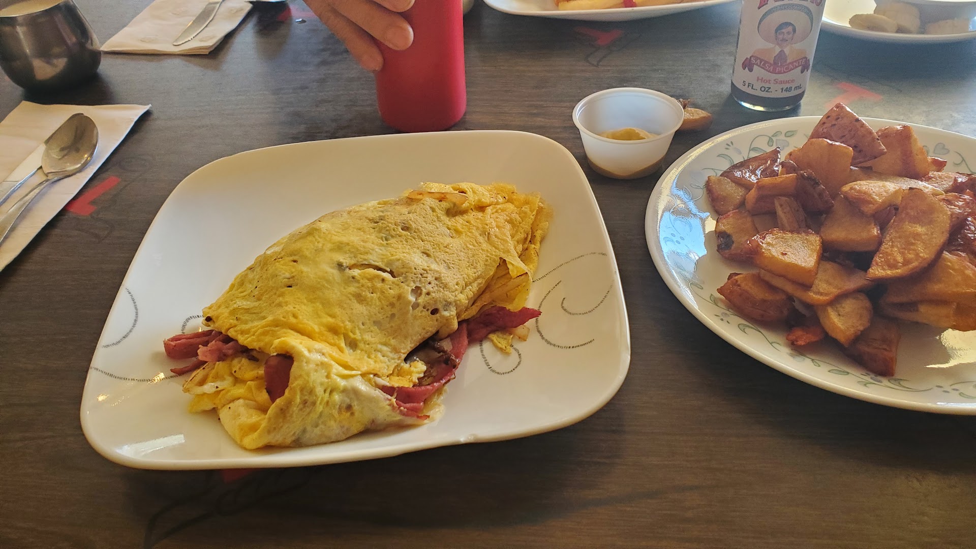 Ā Ā Ā Read moreWaitress was nice and very experienced. Maybe owner? Fresh squeezed orange at 4.95 a glass. Coffee was fresh and very hot just the way my husband enjoys his coffee. Pancakes are cooked well and fluffy. I was very disappointed with the home fries though. After reading Rave reviews about them I wanted to try them. I think I make mine better at home to tell you the truth. First of all itās a small portion. I have had more at other breakfast places. And they put no salt or anything to flavor them. Even the onion needed to be cooked a little more. Itās just the potatoes and a lot of diced onion and a little sprinkle of orange bell pepper and green. Thatās it. No flavor. I think they should fry them with at least a tiny bit of salt. Anyway thought I would share with you. It was a very busy place and I can see many locals enjoy to go orders and eating there. I might try them again in The future and try...