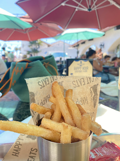 If the side for a meal is the choice between French fries or salad. I choose salad. Even though I distinctly remember at 9 years old, with a small, hot bag of McDonalds fries in my hands, standing under the famous Golden arches, saying to my Daddy, when I grow up I'm going to work at McDonalds. Explaining I could have fries every day. I loved them so much they would be gone before a grease stain could appear on the paper bag. Now that I'm more than grown up, I mostly choose healthy foods over what my 9 year old self would select. Except when I'm at the beach-side restaurant Happy Cat Eats. Folks, listen, you haven't had a French fry until you've had theirs. I don't know the process for cooking these fried delectable potatoes. But it almost seems like they're dipped in batter and fried. They're not, but how do I describe the perfectly thin crunchy outside, with micro bits of extra crunch, with soft, steamy insides? I can't. No amount of thoughtful description measures up. You just have to try for yourself. Diets be damned. Since I was going to hell anyway, I ordered the fish and chips. Need I go on to describe the fish? Best fish and...