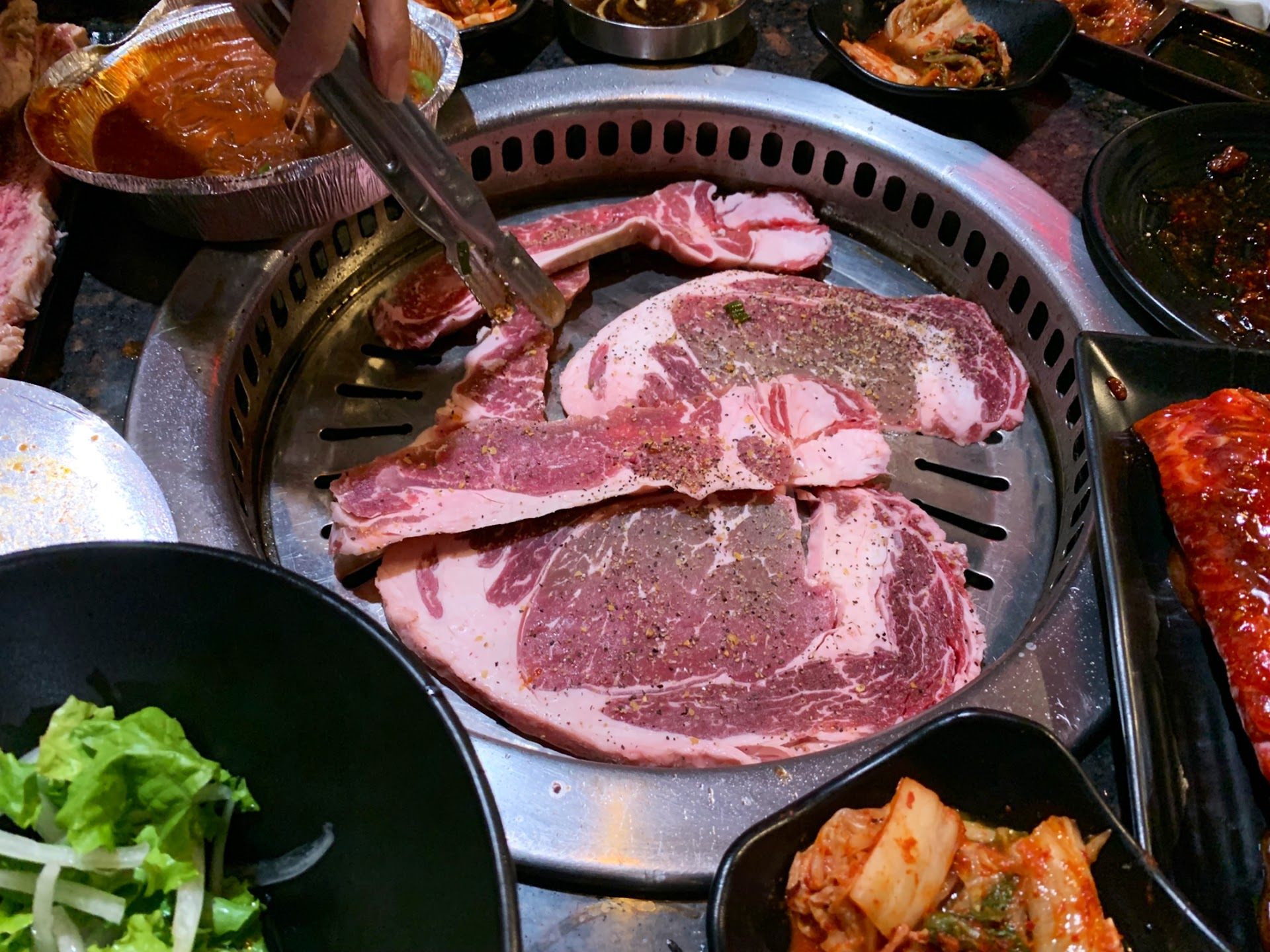My friends and I ate ourselves into a mad stupor here. My party of 3 got here at about 4pm on a Friday. We waited about 10mins before a table was ready for us. After 3pm on weekends they only offer courses B($27) and C($32), so we chose course B. The basic set of kbbq banchan sides are given. All the sides were good except the kimchi and the macaroni salad - they both tasted a bit off. We had a hard time picking which meats to start with so we just went down the menu in order, and so began our animalistic meat fest. We first ate our way through the beef section of the menu along with the baby octopus steamer. The baby octopus was really good, it was flavored with spicy chili paste and had vermicelli & tteokbokki in it. The selection of beef they have is all great especially the bulgolgi. Next came the pork section. The pork selection was all good too, my only gripe is that the ribs took too long to cook through. The miso pork belly was awesome. We started to feel full near the end of the pork section. We especially felt it when we got the pork jowl. It was way too rich and the texture was a bit unappetizing. The restaurant got a huge wave of patrons at around this time (~5:30pm) and there was a small line going out the door. Now onto the last section which was all chicken. We ordered five different plates of chicken and sort of regretted it since we were full by the time they arrived to the table. They charge $10 for every plate you don't finish, so me and the boys buckled down and got to work. The chicken selection was a bit plain. The garlic chicken had no taste really. The sweet and spicy chicken was really good though. It was here where I started getting an insane level of the meat sweats. The heat of the grill, the heat of being absolutely full, and the heat of the crowd made me sweat through my shirt. We had one more plate to finish and it was the chicken bulgolgi. It wasn't as good as the other bulgolgis offered because it didn't get as charred or caramelized as the beef or pork ones. We finally finished up, paid the bill, and left to enter a food coma at our respective hobbles. All in all this place is great. The staff was very attentive and worked really hard to get all the plates out in a timely fashion. I just wish they had more seafood options on the menu. My friend and I weighed ourselves before and after we went to the restaurant and each of us weighed 5lbs heavier. I felt like a big man showing this restaurant the meaning of pure, animalistic gluttony. I highly recommend this place for kbbq. Just remember to wear breathable and stretchy clothes so you can meat your...
