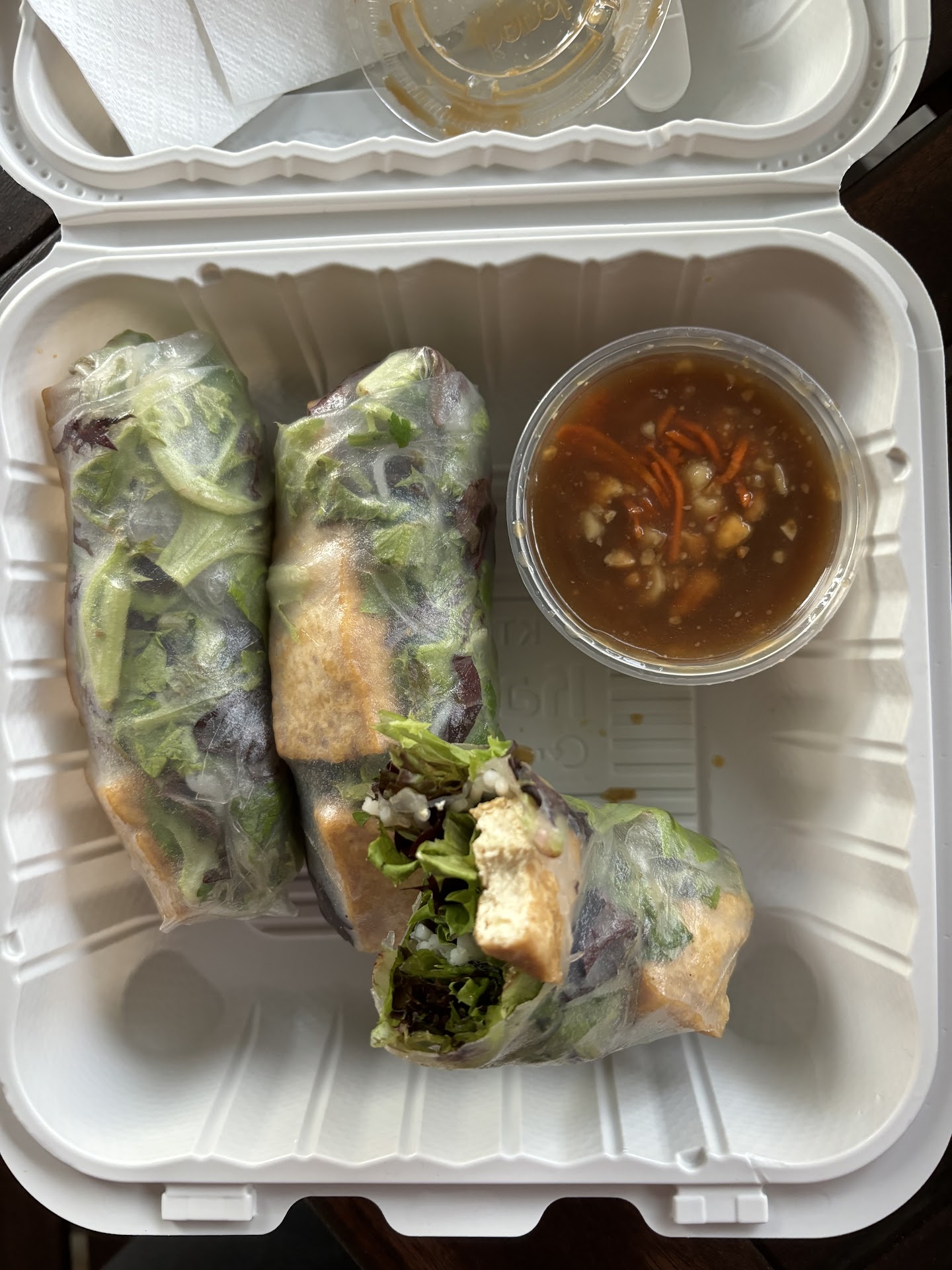 I ordered Tofu spring rolls and Curry Chicken. The 3 large rolls were very fresh, filled with herbs and good sized pieces of tofu. The wraps were moist and the roll had more vegetables than simply being stuffed with noodles.