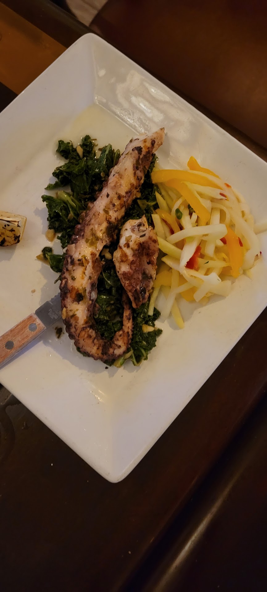 Service: Our waitress brought the bill after clearing the single appetizer and initial round of drinks, but before entrees and secondary drinks (that we had already ordered). We shrugged it off as a mixup and did get our entrees a few min later, but the drinks weren't brought out until our last bites of dinner (~25 min after ordering, without any apology).