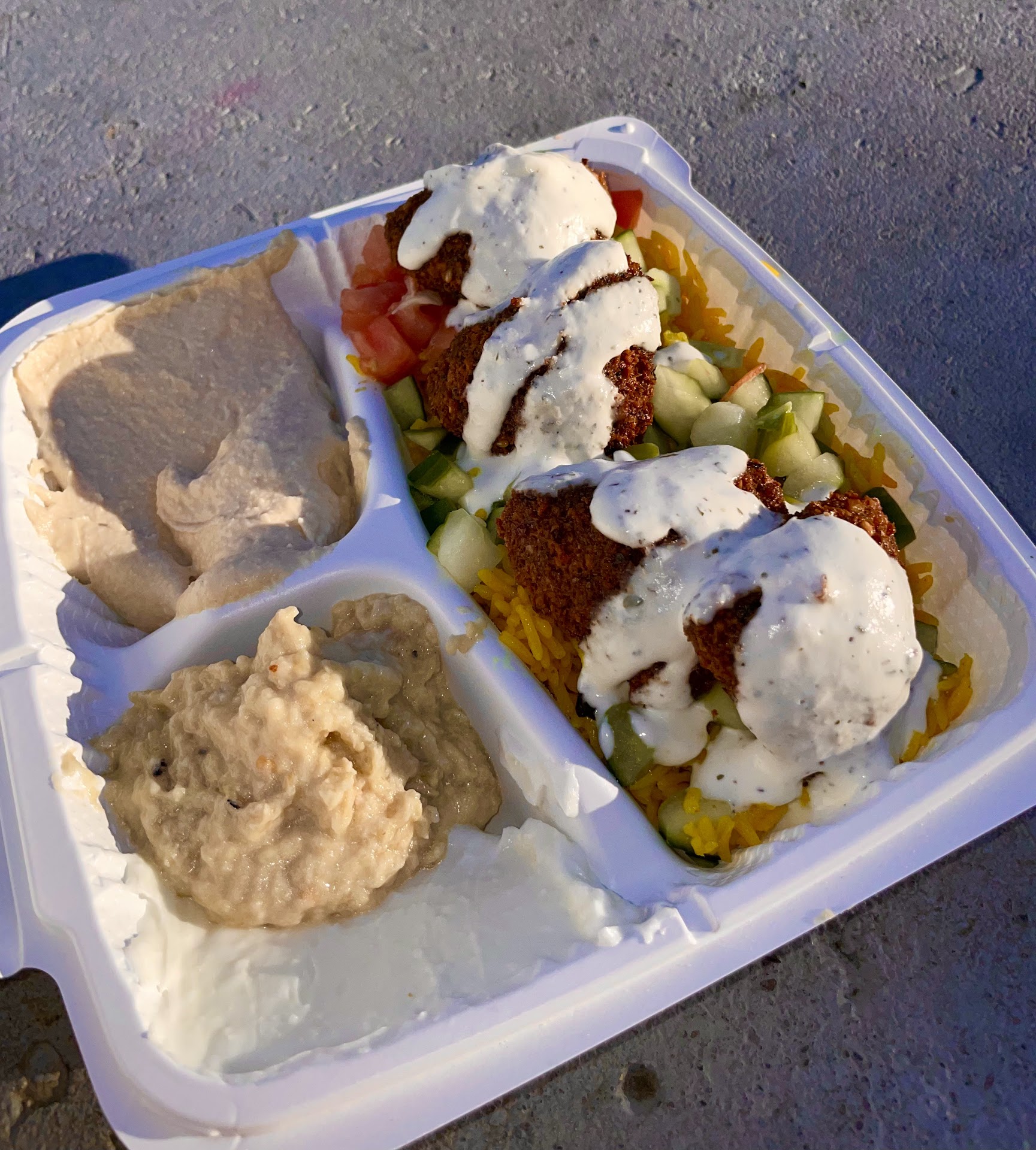 You get to choose a protein + a base of salad or rice then some dips like hummus, achilles sauce, and babbaganoush. Then some veggie toppings + more sauces. I would say their Tahini sauce is bommmb, the achilles sauce tastes delicious, and be careful with the spicy sauce. I got a side of it. I also got it topped with some many sauce. I love this place. I like how you can see all the ingredients, so many toppings are complimentary, and they have the explanations and definitions of what’s in the sauces or dips you’re getting. I’m not a fan of the bobbaganoush but other than that 5 stars baby! I will return. They only have outside seating. Depending on what time you go, bring a coat. The parking lot is small but if you go later we parked in the lot for the dentist...