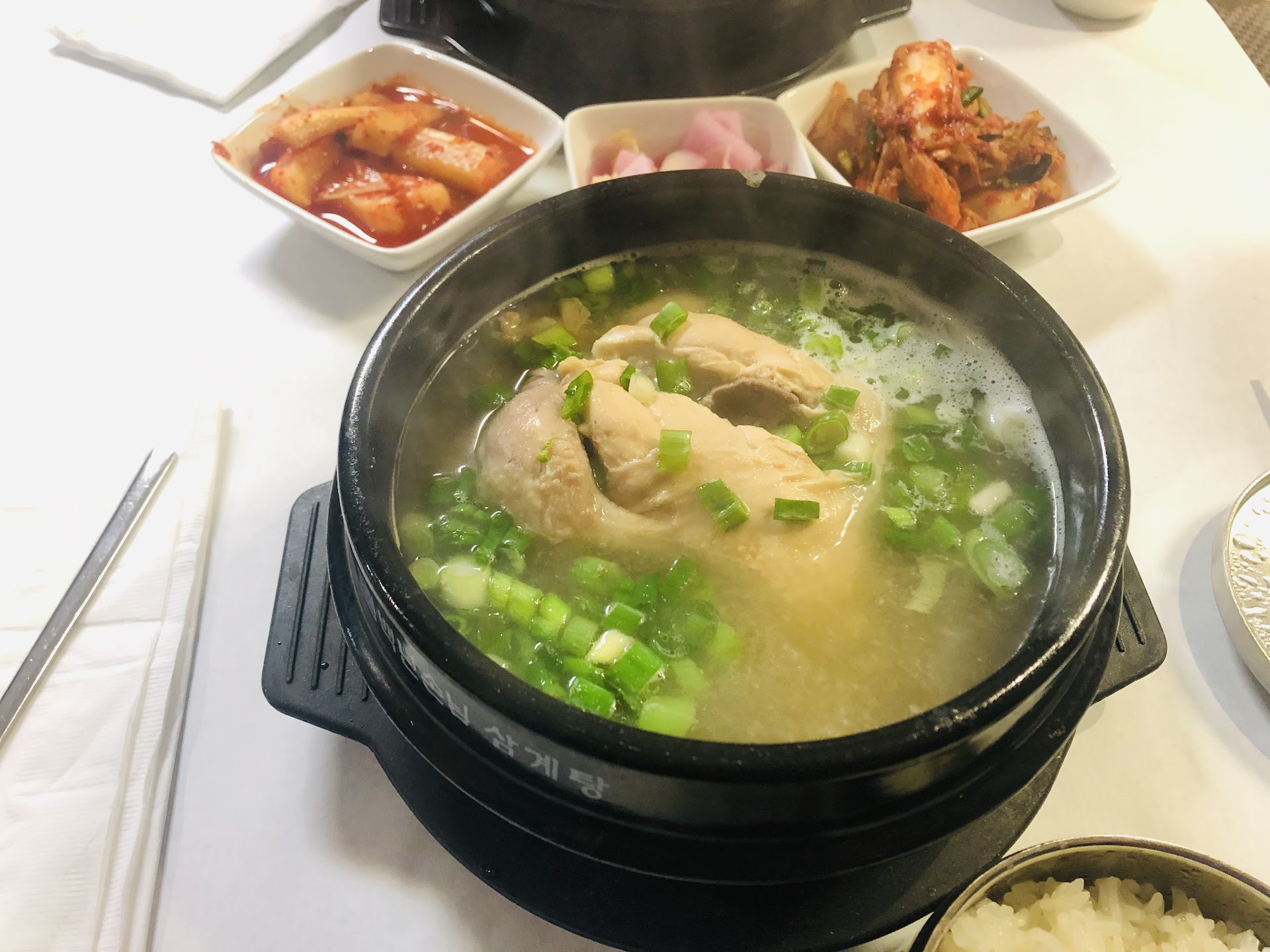 Read moreBubbling Samgyetang... piping hot Fried Chicken... refreshing Naengmyun (cold noodles)... this place has an effortlessly delicious menu! My coworkers and I came here for a lunch outing and they were able to seat 8 of us at a table (we called ahead of time over the phone). They only give kimchi and kkakdugi with your meal. I like that they keep it simple.