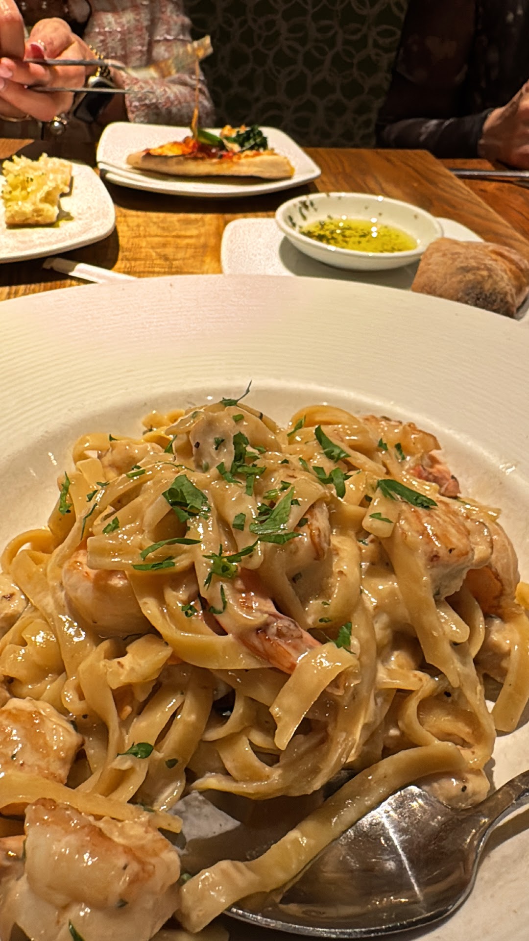 Ordered 2 pizzas, not bad, but the portion of the Chicken Tequila Fettuccine was small, three people could have only 2-3 bites. The waitress only served us 4 tiny pieces of bread, each piece was one bite only.