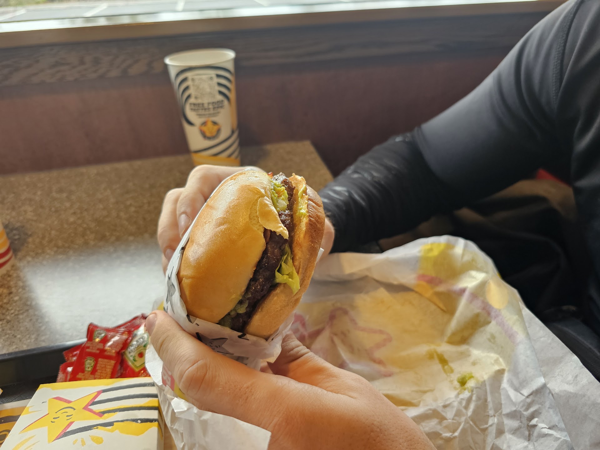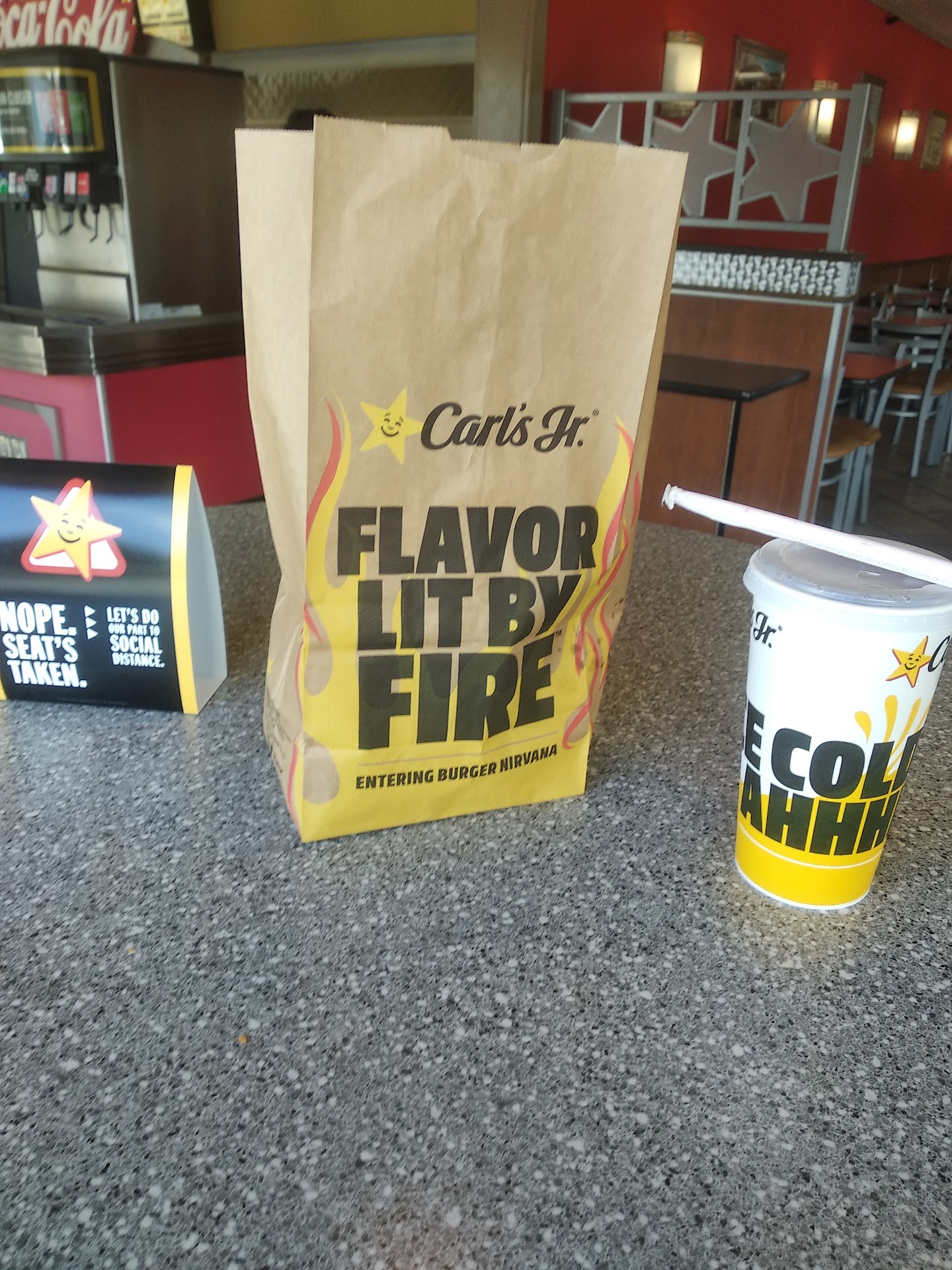 Unfortunately this Carl's Jr has gone way downhill. There used to be a friendly, safe, comforting feeling here, but no more. No more salt and pepper shakers on the tables, no napkins to be found anywhere, it's dark, dim and it's got a cold feeling and strange "on death row" vibe.