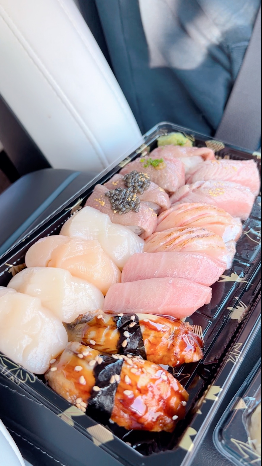 • Aburi Kagoshima A5 Wagyu with caviar nigiri 5/5 yummy ! • Scallops nigiri 5/5 so so soooo good!!! The texture and flavor is mind blowingly good for takeout sushi • Salmon Sashimi 3/5 super fatty pieces • Unagi nigiri 5/5 perfect marination and taste! • Hokkaido Scallops Sashimi 3/5 nothing special about the taste here • Aburi Bluefin tuna Otoro nigiri 4/5 • bluefin tuna chutoro nigiri 3/5 really fatty • Aburi Kagoshima A5 Wagyu nigiri 4/5 • Aburi salmon toro nigiri 4/5