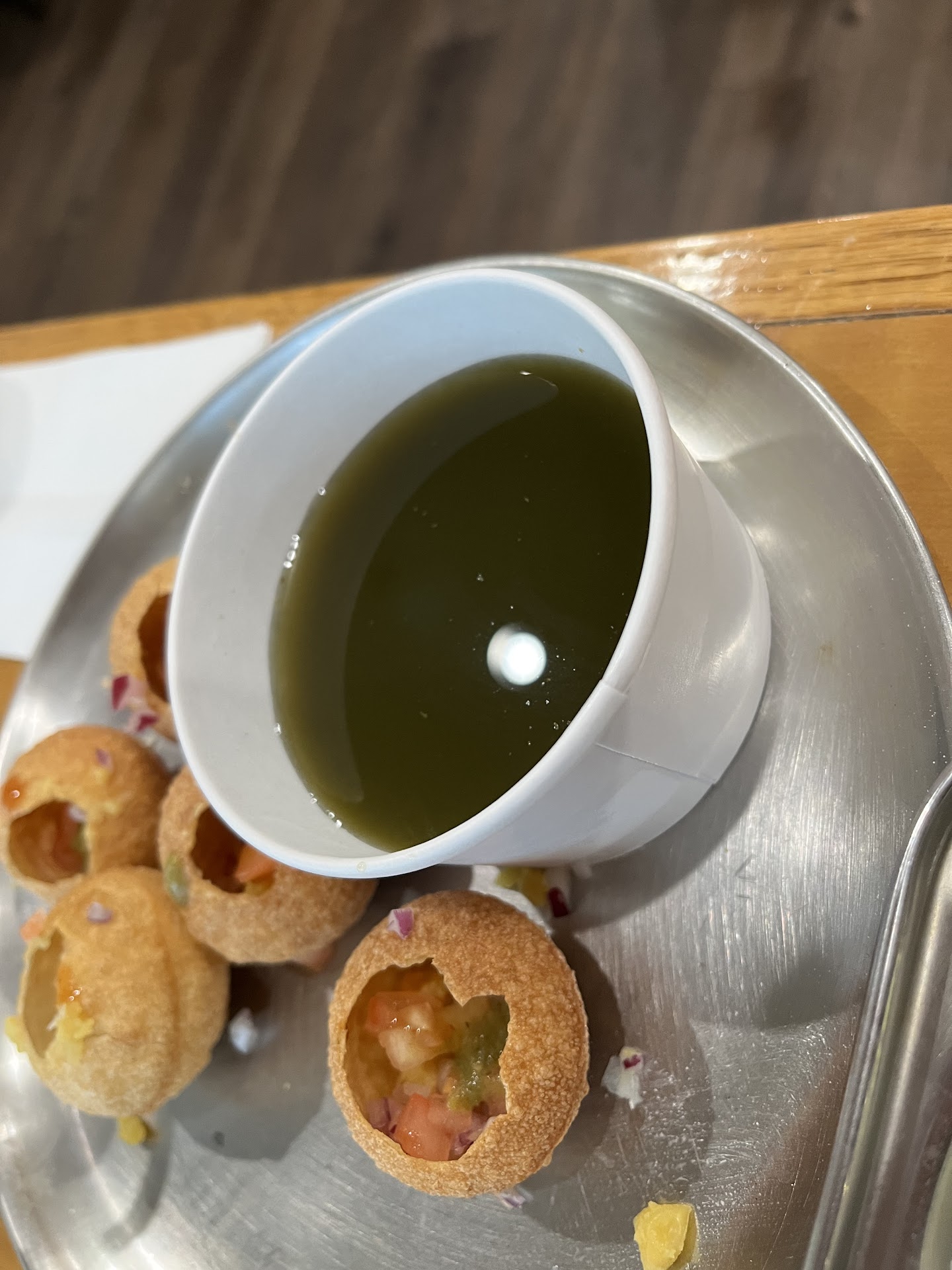 They gave pani puri for those who got live dosa. I didn’t find it very good and would be disappointed if I had paid for it separately. Puri was too crisp and lacked taste. Stuffing didn’t seem to be traditional potato Chana but tomato onion mixture. There may have been potato but was such a scanty amount I missed it. Pani was meh, not terrible but not great either.