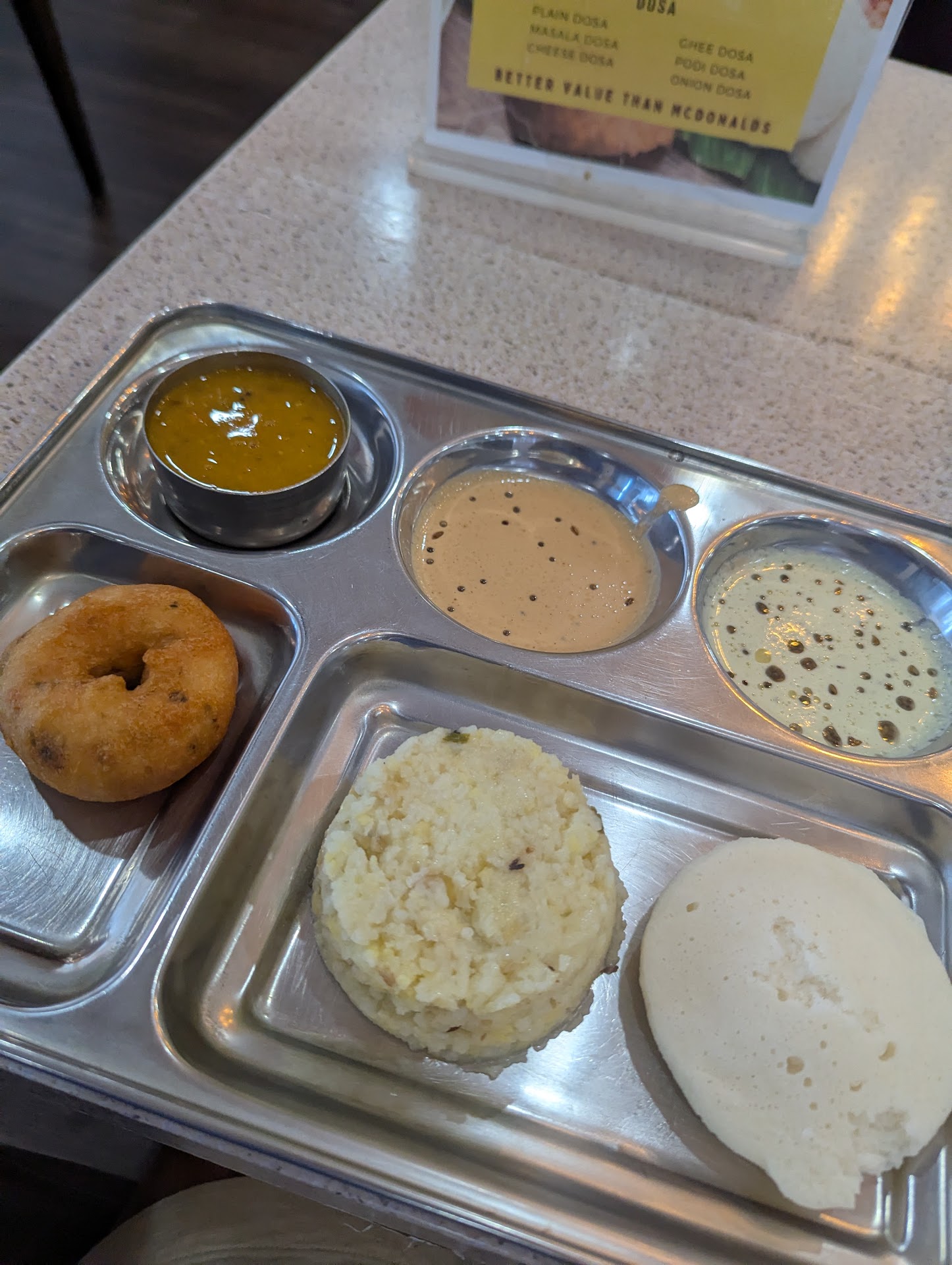 Read moreI am not against hole-in-the-walls. Some of the best food can be had in obscure places. Chennai Tiffins exhibits all the traits of a standard Indian hole-in-the-wall. Strip mall location, barebones furniture, stuck watching YouTube ads, the list goes on. But it would have been worth it if the food compensated for it. And, sadly, it did not for me. In an area where one can toss a pebble and hit a dozen south Indian restaurants, Chennai Tiffins, with all its regalia of Madras hanging on the walls, could not instill the nostalgia with its idli or vada. The menu, per the norm at such places, was pretty lengthy. I got the idli, vada, and pongal combo. It came out soon enough, but the idli was off in consistency (firmer than expected). The vada was fine in texture, but lacking in flavor. The pongal was passable and the best of the three. The sambar, it must be said, was excellent. That alone deserves a star (since it is used as a side dish in more than half the orders). I am always curious to see what a restaurant's specials taste like, what could they conjure up that deviates from the norm. I tried the Vijaywada Paneer dosa. I don't know what I was expecting, but I got a lot of dosa that was smeared with a spicy chutney and grated paneer. The combo did not work well. The paneer felt like an afterthought and there wasn't much of it in each mouthful to scoop up. I may have to try something else...