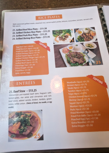 Good affordable Vietnamese food. Not oily. Tried the Grilled Pork plate and Crispy Egg Noodle dish. Grilled pork was well seasoned with sweet and salty taste. Served with rice, pickled carrots and radish, fresh veggies and a side of fish sauce. You can choose additional "topping" of other protein or egg roll for a couple of dollars more. The Crispy Noodles dish has veggies, chicken, shrimp and veggies with gravy. Gravy has a light chicken broth taste. So why not 4 or 5 stars? Food is good but flavor is on the lighter less complex side. Will return to try their pho next time I'm...