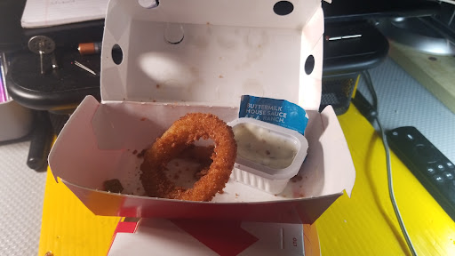 When he passed me my food, he handed it to me and let go before I had a chance to grab it. When i caught it, the bag ripped, and my order fell to the ground. He said whoa careful, you didn't grab the bag." He didn't give me a chance to grab it. I proceeded to pick up the mess on the ground and put it in the ledge so other drivers wouldn't run over it and mess up their cars with the sauce packets and what-not. He said, "Stop, we will clean up "your" mess and remake your food. We waited another 5 minutes in the parking lot, and when he brought my food out, he said, "Are you ready? I don't want you to drop it again." The audacity. I didn't drop it, he hand it to me rudely, and the bag ripped. This was not my fault, and I 100% did not deserve to be berated by some guy in the drive-thru who obviously needs to slow down a bit and not rush the customers. He did not include ranch when he brought the order the second time and didn't wait around long enough for me to look at the order. We had jalapeรฑo poppers without ranch. We did get honey mustard, which we didn't ask for. This person should not be running the drive thru. Absolutely awful service. I have never been treated so rudely in a druve-thru. Maybe he is handling drunk people or rude people all evening. I get it, but I am not one of those people. 2 thumbs down.