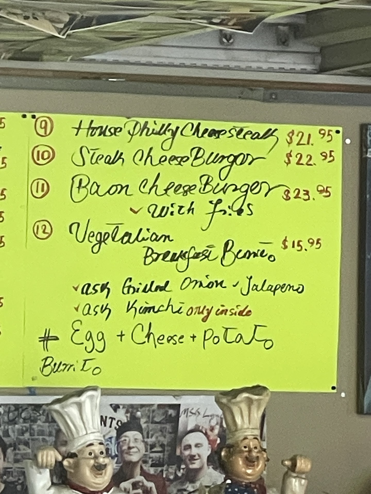 Everything we saw on the menu was under $20. Kenny does everything, customer service cooking, etc himself. There are a ton of photographs of past customers decorating the walls to look at while waiting (the photos made us want to come back to try a burger sometime because they look delicious). A good amount of indoor and outdoor seating available. A nice selection of bottled beverages. He takes card, but prefers cash (totally understandable for a small business owner) which is what we paid with.