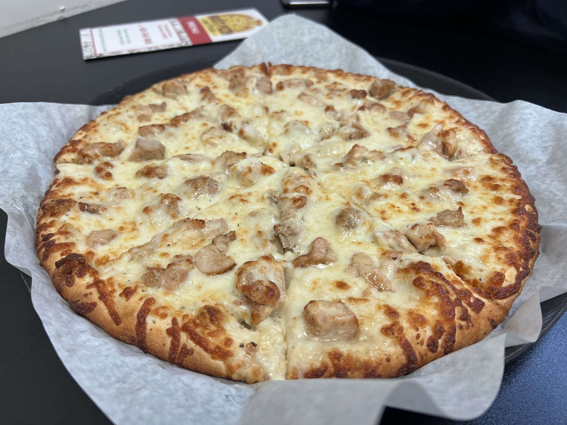 The food came, we ordered the garlic chicken pizza, the crust was really good, I bet the other flavors were good too (their menu had a lot of pizza options). The burger was insanely large and I was surprised how good it was for a really cheap deal. It was a solid place