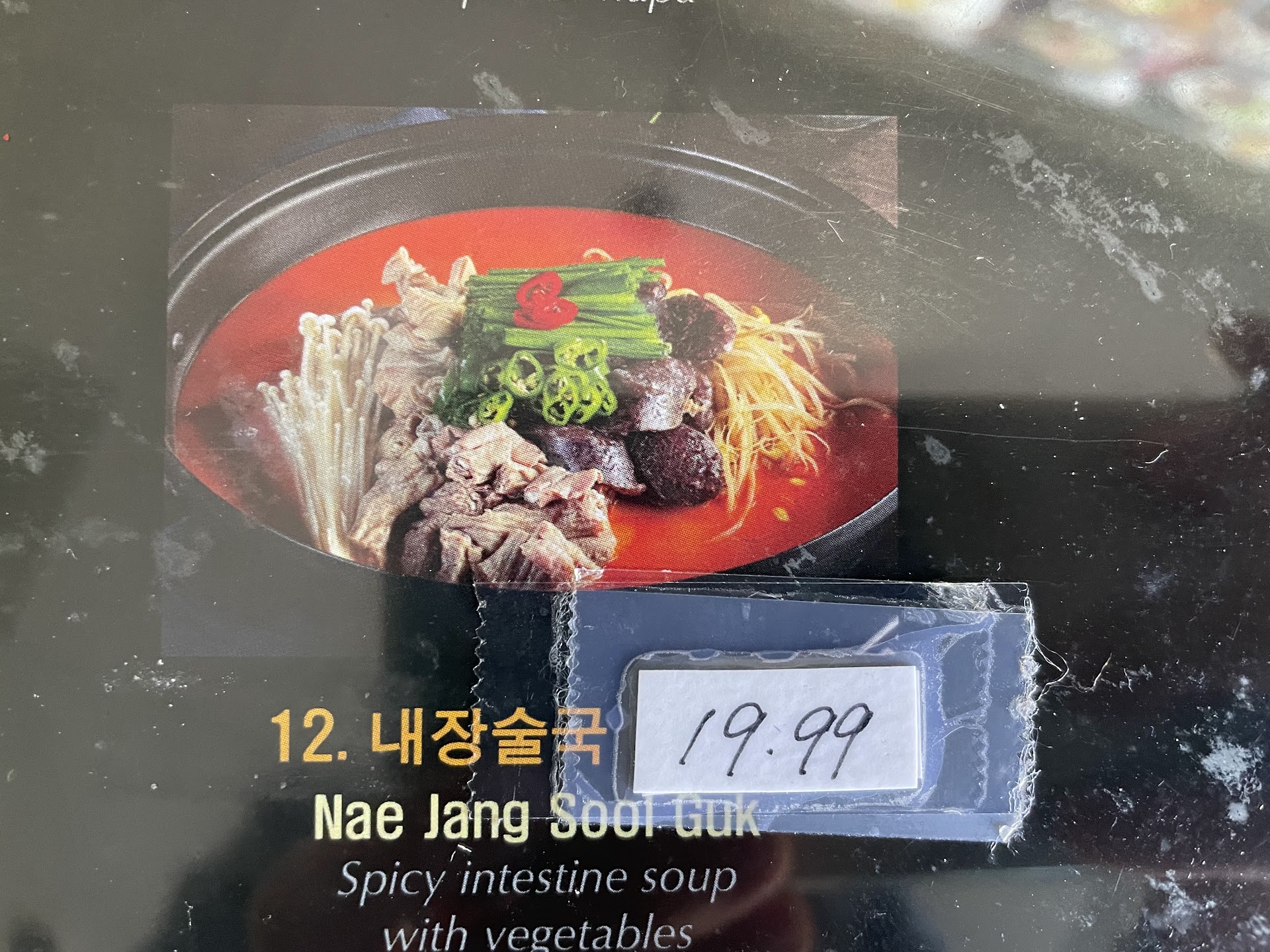 I ordered the Nae Jang Sool Guk (spicy intestine soup with veggies) and it came out looking extremely different than on the menu.