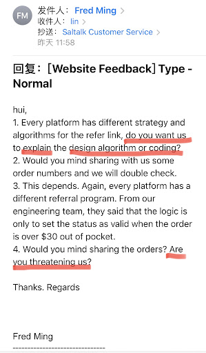 At the end of October, we contacted Saltalk’s previous customer service to inquire about recent platform updates. We learned that the original representative had moved to other duties, and he didn’t have an answer about our delisting, redirecting us to another customer service representative.