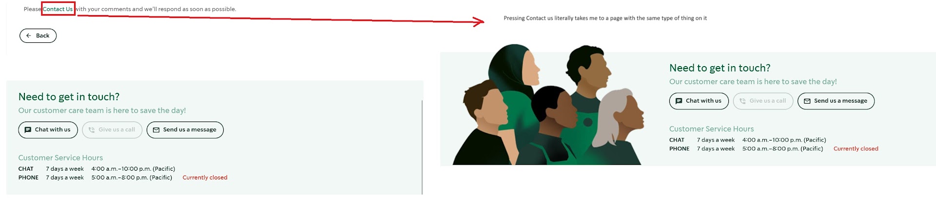 It's irritating, I only recently started coming back due to other Starbucks screw ups (database issue erasing my SB cards and taking 6 months to fix it). And again Starbucks drops the ball..I would have never thought they'd make it so hard to actually leave internal feedback (hence...