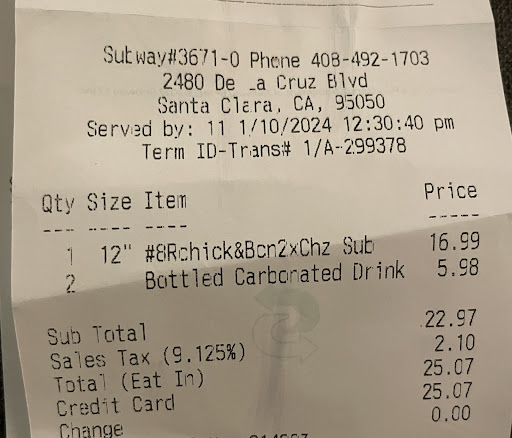 Read moreVeggie sandwich with lettuce, tomato, onion , black olives and bell peppers, nothing extra. no drink. no chips. I dont know if i got charged for something extra because they gave me no receipt and just walked away. If i go to a different subway same sandwich almost $10.Theyâre scamming here. I eat subway 3-4 times in a week so i know prices. Please make sure about price...
