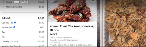 What a disappointment. I ordered the Korean fried chicken dish, which is supposed to come marinated in sauce (See photo I on). Also supposed to include your choice of one of three types of dipping sauce. I received the chicken bone dry with absolutely no sauce (See photo #2) To make it worse the dish came with no spices, seasonings or other ingredients leaving it absolutely flavorless.