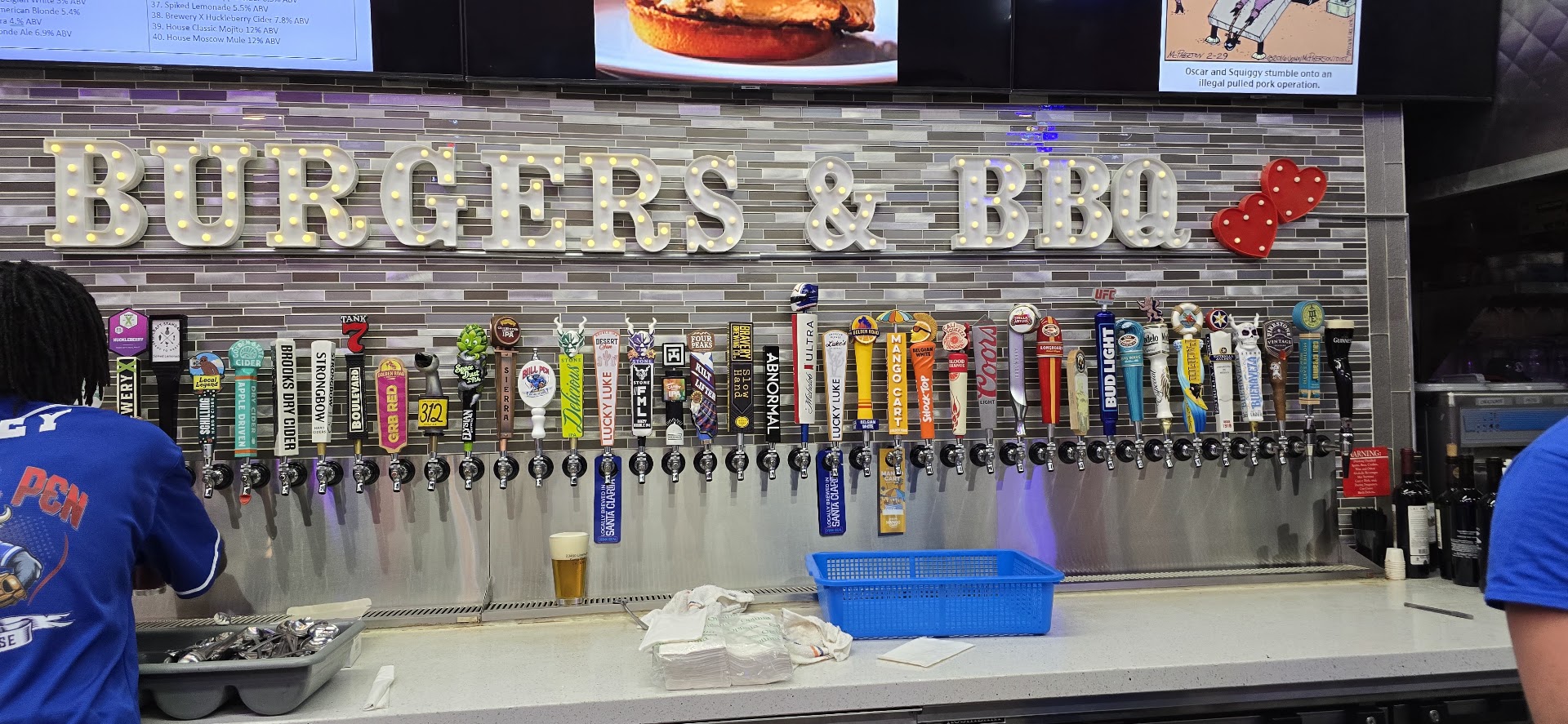 Read moreI've been hearing about this place for a while and finally went in today for lunch. I went at an off time, just after lunch so I could see how things go in the down time. The place was clean, and we got smiles and a conversation as soon as we walked in from Jen. She was very helpful, gave us samples of some of the taps and told us to have a seat, if we needed, to take in the whole menu, which was extensive! We landed on a 3 meat trio and a couple of taps. We got pulled pork, brisket and chicken, beans and Mac & cheese. We didn't wait too long and it came out fresh and hot! We got a sampling of all their sauces and. I prefer the spicy BBQ, but they were all good. The Carolina sauce was surprisingly what a Carolina sauce should be like, but a bit better! We were pleasantly pleased with our food and Jen came by a few times to make sure we were good. A great conversationalist, we chatted and enjoyed our food. It was a super hot day, but nice & cool inside. Lots of screens for games, a group section for large parties and a little video game area with foosball, darts and some arcade games made it a well balanced place. Overall, the food was good, atmosphere was good and we will definitely be back. No table service from a server, but they came by to make sure we had all we needed. A good...