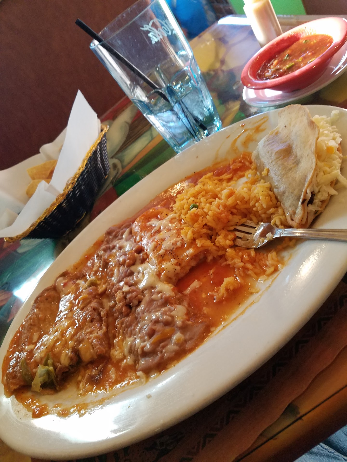 I just moved into the area so I am doing a food tour. While on a walk I noticed this restraunt and decided it was time for lunch. I walked in the front door and was greeted with an upbeat atmosphere. I waited at the front for a brief moment until a server asked how many. After answering i was led to a table. Sonce it was my first time i wanted to really loom at the menu and try some things. So instead of normal fajita order i tried a combo plate with, cheese enchilade, chili rellano and a beef taco. It also came with chicken tortilla soup and rice and beans. All of that food for 14 bucks!!! Value!! The chips and salsa are okay standard faire. Nothing to write home about but will do the trick while waiting. The cheese enchilada was by far the worst thing i tried. It was bland and had nearly no flavor sadly. But now onto the good stuff. The chili rellano is a solid take on ehat you would expect. Seasoned and cooked well. The shredded beef taco is crunchy and very flavorful. Surprise best thing? The chicken tortilla soup, it had so much flavor and just tasted amazing!! If you are in the area and looking to eat some mexican food check...