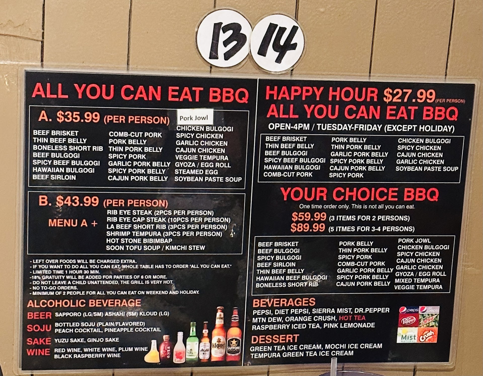 Reviews are all subjective, but I think this is the best Korean BBQ in town. There's three different levels of all you can eat you can order, so you can save a little per person if you don't need fancier meats. Overall I think they're all pretty reasonably priced. The base AYCE comes with plenty variety of meats for most people, you'll get the mainstays like Bulgogi and Brisket. As of this review, the three price levels are: $29.99, $32.99, and $39.99. What is also nice about this place is that they will bring a whole bunch of small plates of condiments to the table with the AYCE meal. All of the sides are delicious, they're probably my favorite part about this place. They offer a nice break in flavor between all the meat. Some examples of the sides are Kimchi, pickled radish, glass noodles, kimchi pancake, salad, etc. The staff has also always been great in my experience; welcoming, quick, and efficient. The Tempura Green Tea Ice Cream dessert is also delicious, a great way to end the meal. I don't think you can have a...
