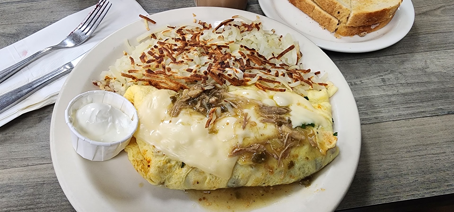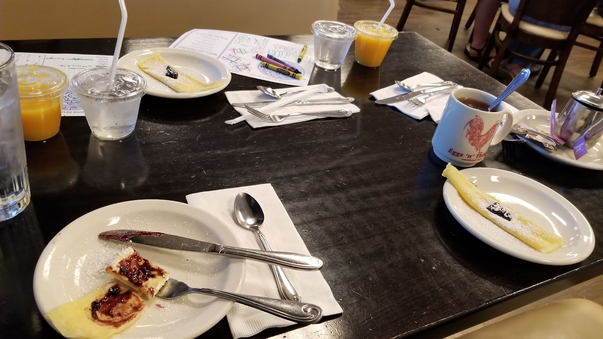 Food: As promised, four Swedish pancakes arrived before our entrƩes. They were heavenly. I might drive to Southern California to have a whole plate of them sometime. We got a classic egg breakfast, Chicken Fried Steak and eggs, French toast, and eggs and bacon. The coffee and half and half was well above average.
