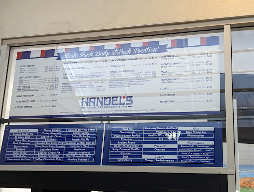 Read moreWe have been here 2x in the last several days. I guess that says a lot. I guess we are somewhat ice cream snobs, preferring smaller batch made. For a store offering 42 flavors, they make a very good product. The ice cream is very creamy, and they store it at the perfect temperature so that it is firm but spoon friendly. Many of the flavors are overly sweet with a lots of syrups, candies, etc added in. However, there are a handful of fllavors that are more basic such strawberry (the original flavor), coffee, etc. The first time I order the smores and it is definitely a full dessert with marshmallow and chocolate added. However, it is very yummy but really sweet. The 2nd time, I ordered the strawberry which was also yummy but much less sweet. If we go back a 3rd time, I think I will try the coffee. My hubby got the coconut cream pie in a waffle cone the first time but loved it so much, ordered the same on our second trip. The store is very clean looking but note that you will be ordering at one of their many windows and then leaving to find a seat nearby or eat it in your car if it's chilly. I definitely recommend giving Handel's a try. However, look online first to choose your flavor. If you click on the flavor, you will see a short description which I found helpful. Serving sizes are very large with a small dish being...