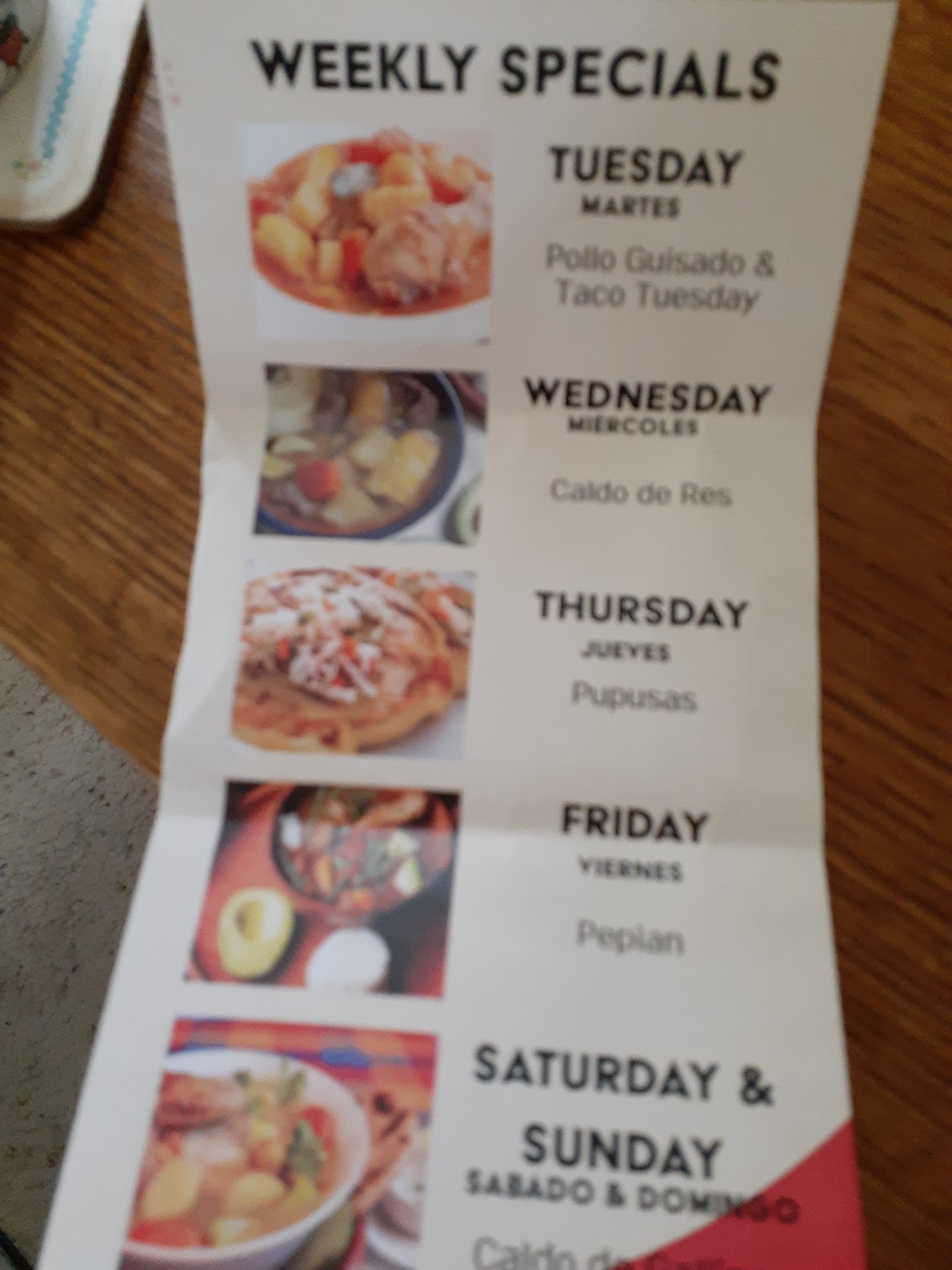 Ā Ā Ā Read moreRecently, we tried the Thursday Pupusas special, both beans w/ cheese and carnitas. The cabbage slaw and accompanying salsa is a perfect compliment to the Pupusas. My husband has previously raved about the huevos rancheros! This restaurant advertises as Peruvian, Mexican & Guatemalan. They list a diverse menu, with such items as pupusas, ceviche, zarapes, pepian, tacu-tacu, pollo guisado and you can find tacos, chile rellenos, enchiladas, tamales and more. A small business worth a...