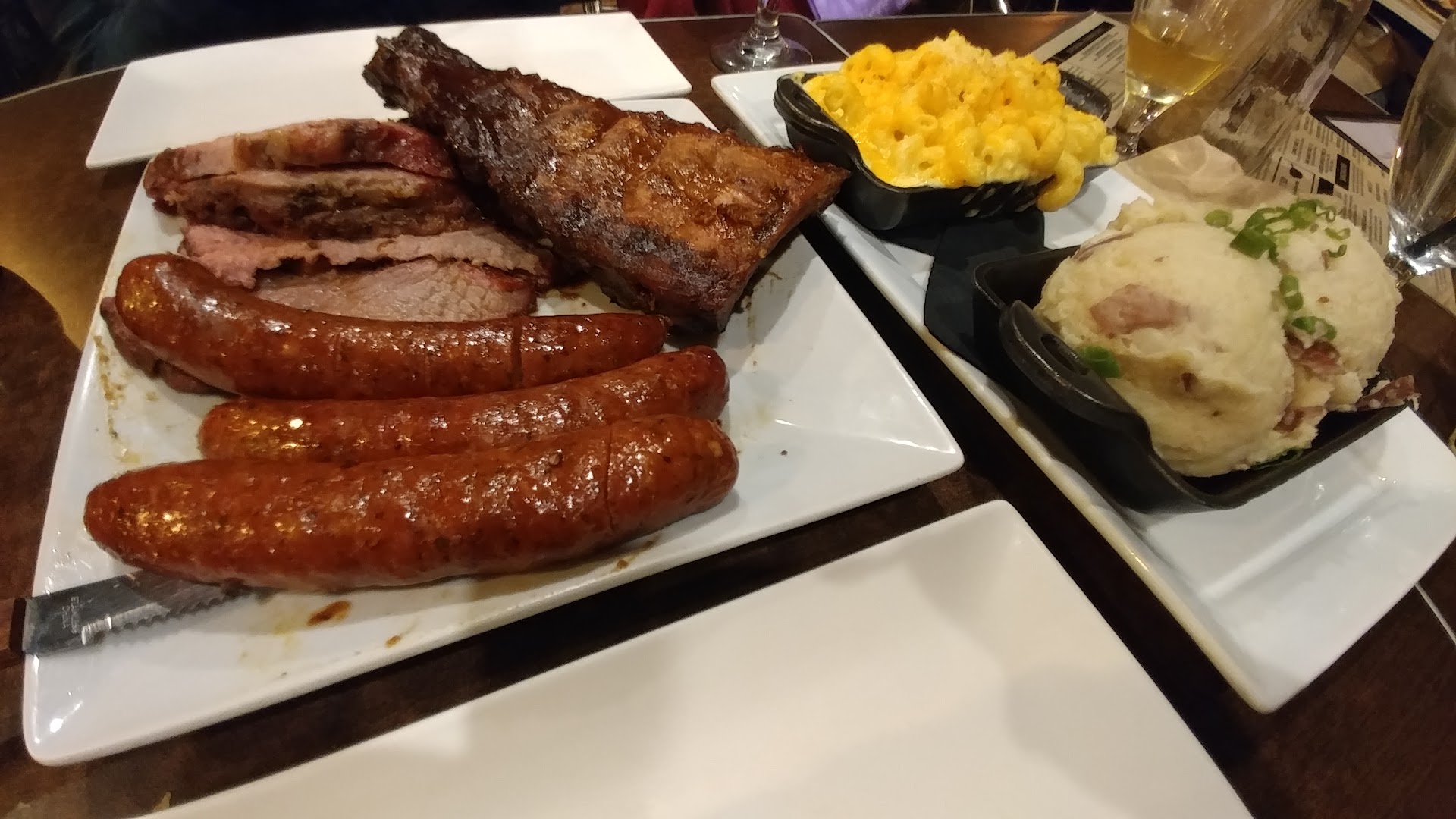 Read moreNot a bad place if you are looking for a beer and sports on tv on Main in a bbq style setting. HOWEVER, if you actually want good BBQ, a LOT more of it for a lot less $$$ then go to Bear Pit BBQ in Mission Hills (not amazing but so much better by comparison). Unfortunately, service is super poor with a smile in a classic LA way (see below), sides are ironically much better than the proteins which also cost more per ounce than Larsen's steakhouse. Initially sat outside but it was getting too cold for my wife and several tables freed up inside (visible and confirmed by server). I specifically told the server that my wife was pretty cold and asked for a warm inside table. After making us wait for another 20-25 minutes she literally sat us at a table right in front of the door so that we would get blasted with frigid air every time the door opened (frequently). Took forever after we ordered a beer for us to be told that the beer we asked for was unavailable and then even more time for server to return so we could order another one. This was either intentional or careless. Like too many places in L.A. fake server and staff were superficially quite pleasant but not actually helpful, attentive or responsive... (in addition to the table, asked for an extra knife then nothing for 5-10 minutes, had to ask twice so we could actually eat and then got two knives dumped on us, despite taking so long to serve, staff constantly hovered over tables to clear plates before they were finished I supposed to turn tables, etc...). Not great either way and the place was a little busy but not packed. Expect to pay $50-90 per person for a complete meal before alcohol. For that money, go to Salt Creek or Larsens and actually eat well. $20 for 6 wing drumlets (which were pretty good actually) and $40 for three strips of dry brisket (maybe 8 oz) and $40 for half a smoked bbq chicken (LOL). The spinach side was quite good as was the corn (warning you have to pay $2 extra for corn lol). First time I have been to a relatively well rated BBQ place where the BBQ was the worst thing on the plate. The BBQ sauces in glass whiskey flask style containers is a cute touch but the servers apparently don't clean the caps or mouth as they were all gross. At the end of the day, everyone knows SCV is not a BBQ town and Main is much more about alcohol and our experience at Smokehouse merely...