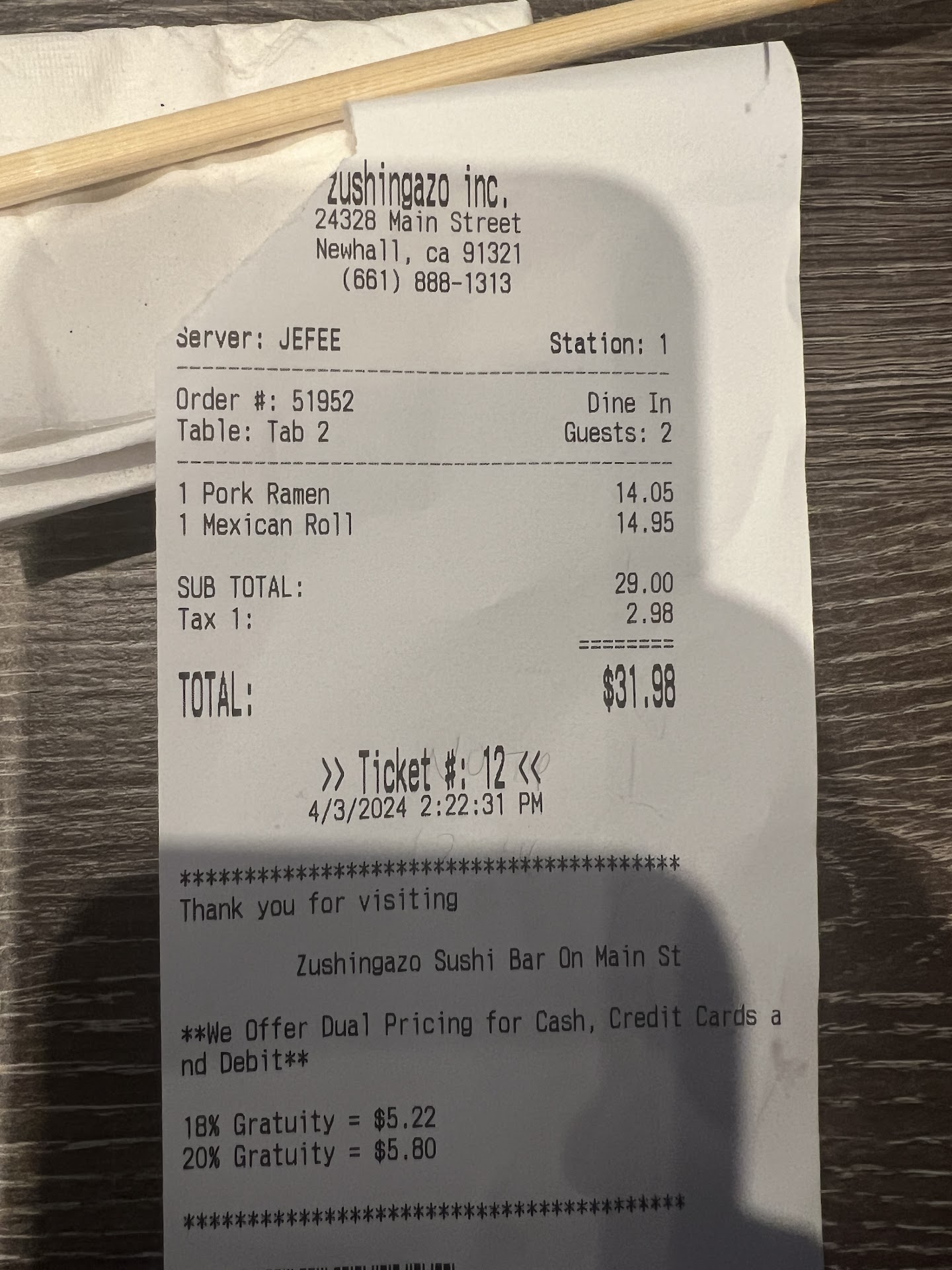 We came in Weds afternoon around 1ish. Place was pretty empty. I ordered the Mexican roll first with the intention of ordering one more roll after trying this one first and Iām glad I didnāt order another one. Well, it wasnāt like I could order another anyways because after the server dropped off our food (that took forever) he never came back to check in on us. I had mentioned that I was going to order another one too. But nope! Not happeningā¦
