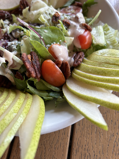 When the hors d'oeuvres finally arrived, my fiancé asked another staff member if the peach sauce was spicy. He was told it wasn't, but after tasting it, both he and his mother experienced intense heat and heartburn. Shortly after, our meals arrived. My salad was beautifully presented, my fiancé's pulled pork sandwich was good, and our friend's BBQ chicken looked appealing. However, Shelby failed to notice she had completely forgotten my mother-in-law's fish and chips. When it eventually arrived, it was clear it had been frozen--the batter was soggy and tasteless, the fries were wretched, and the coleslaw was the only redeemable item. We had to chase Shelby down for condiments like ketchup and vinegar.