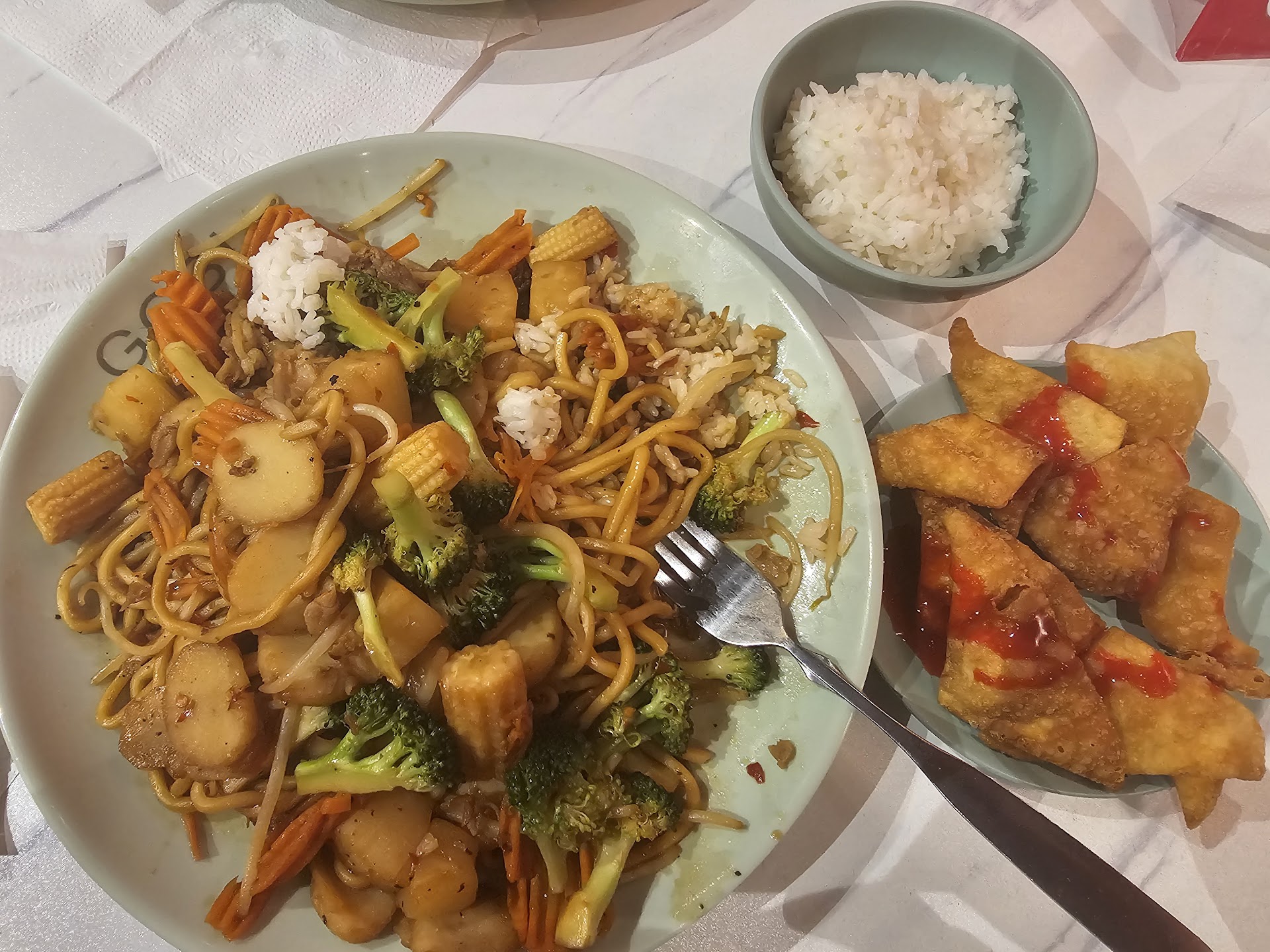 I added some sticky rice from a serve-yourself pot. And a healthy pile of fried won tons - the good kind, where they are just fried and not filled with stuff first! There were a couple of sauce options there too, but I went simple with a drizzle of sweet and sour. Tables were (tonight, anyway) seat yourself.