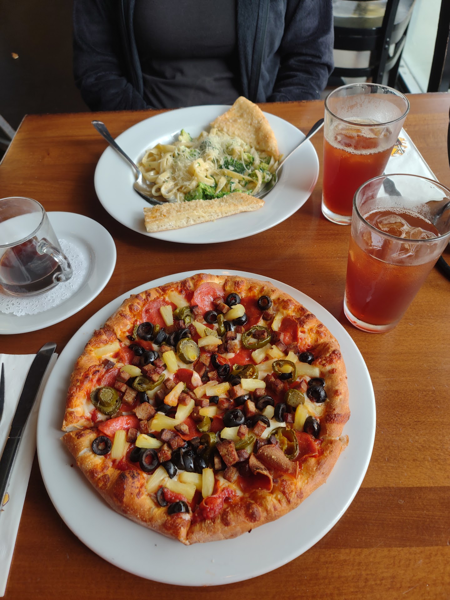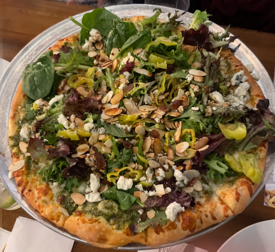 For a bev we started with the ginger mojito which was refreshing, gingery, sour, and sweet all at the same time. The mojito was INCREDIBLY carbonated which just amplified the flavor! The only thing was the drink just had wayy too much ice in it , so definitely ask for less ice if possible. I got the Kianti’s gourmet pasta with bacon on the side so my vegetarian friends can try some and I appreciated their ability to put some ingredients on the side. The pesto sauce was insanely creamy and tasty which the perfectly cooked bowtie pasta well. The pasta also had plenty of sun dried tomatoes on it adding plenty of texture and a sweet and savory taste. The pasta also came with some really fresh bread which accompanied the remaining sauce from my pasta really well! Now the pizza was amazing with a cool salad on top of a regular pizza. The crust of the pizza was super soft and tasty, but on the menu the pizza is listed with a thin crust but the crust was not thin so beware when ordering. The soft crust paired perfectly with the crunch of the leafy greens and roasted almonds from the salad on top! The 2 dishes and the drink was enough for 3 really hungry people and we even had leftovers of the large pizza. The bills was $67 pre tip so would say it was somewhat affordable for an Italian place.