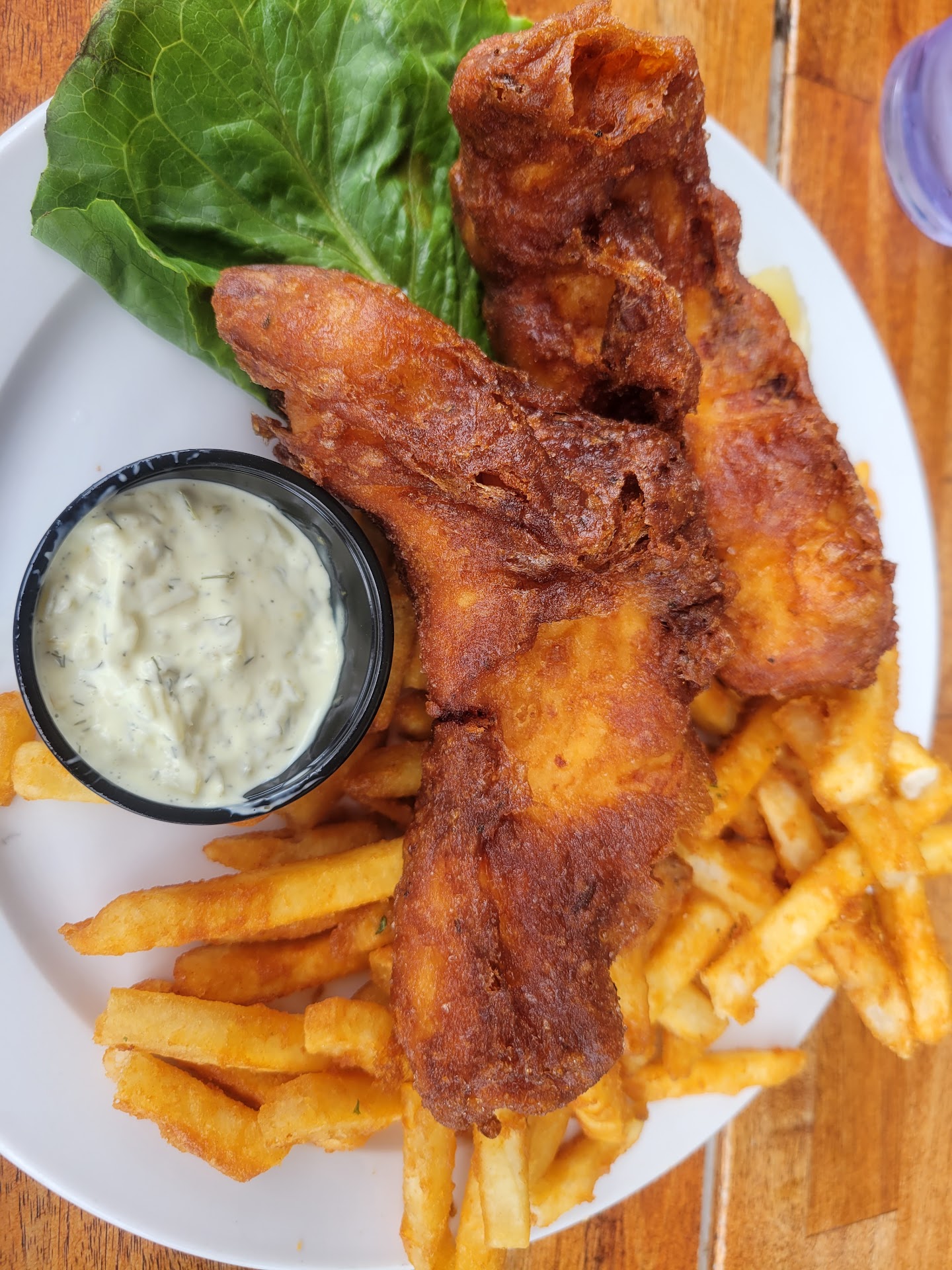 Fish 3.5/5 Great batter. Massive portions. Great taste. They don't do cod unfortunately but give massive filets of salmon. It's a bit of love and hate. The salmon is great at first but can become overwhelming in a few bites. Cod has a milder taste that serves as a good canvass for the tartar sauce. Still very good, best if shared.